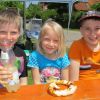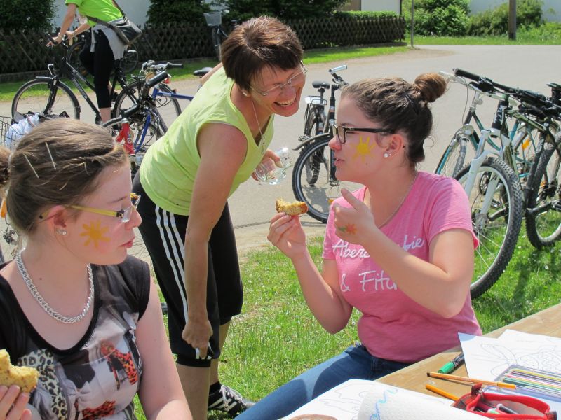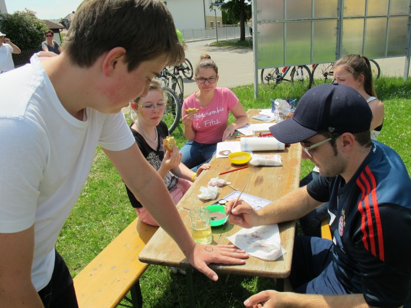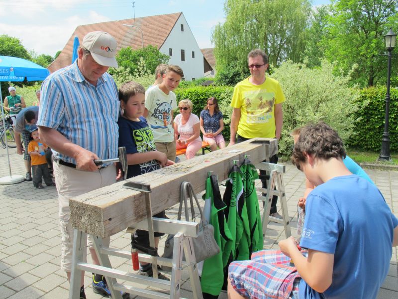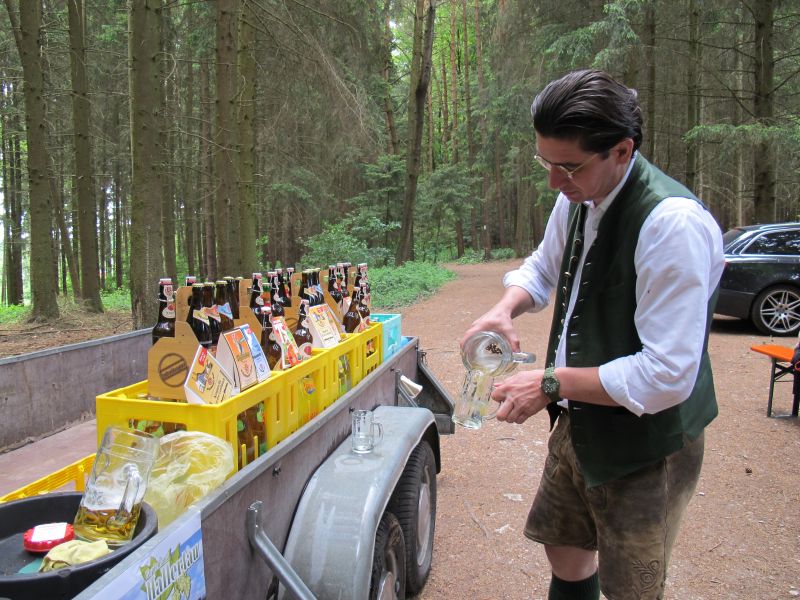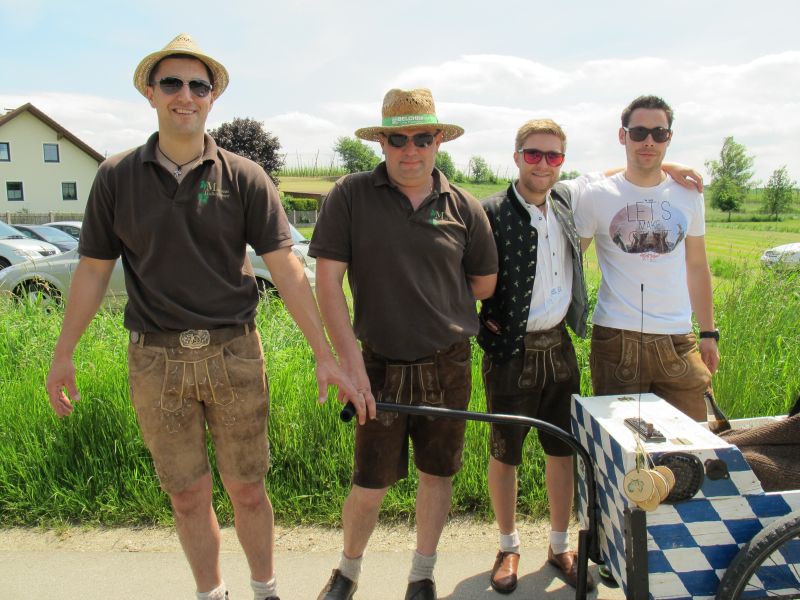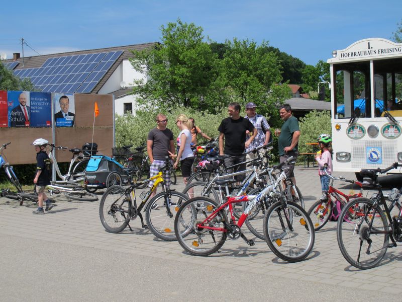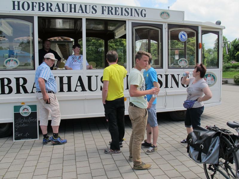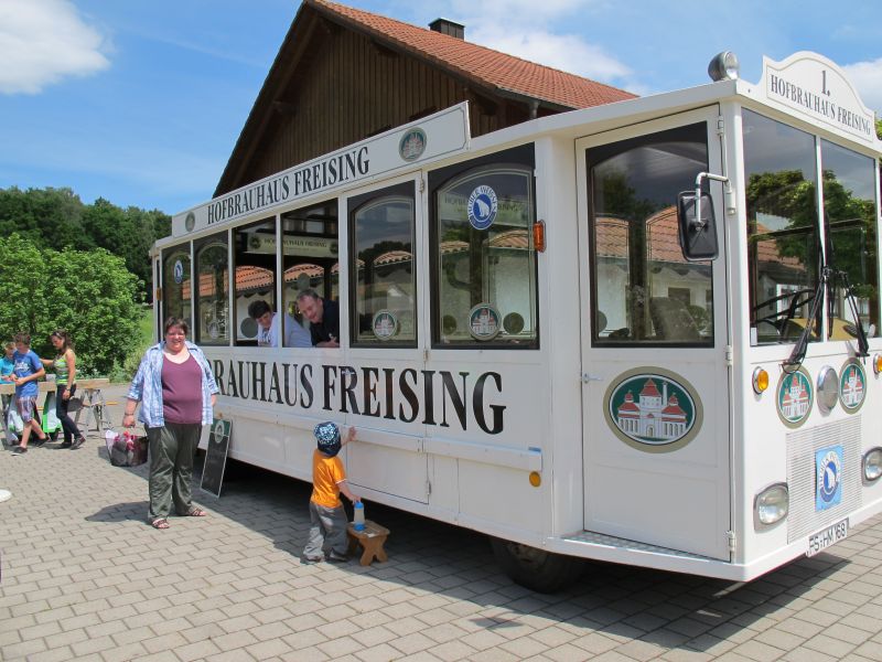 Weiter ging es nach Leitenbach. Dort wartete für die Kinder ein kleines Programm und ein Bus vom Hofbräuhaus Freising. Letzte Haltestelle vor dem Ziel war die Kapelle auf der Theresienhöhe. Spielwaren Hoppala stand dort für Naturbasteleien bereit und die Brauerei Schmidmayer schenke hier das kühle Nass aus.