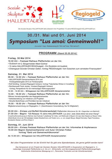 Das Symposium wird am Freitag, 30.05. um 19.30 Uhr mit einem Grußwort von 2. Bürgermeister Albert Gürtner im Festsaal des Rathauses eröffnet. Danach gibt HALLERTAUER REGIOnal Vorstand Manfred“Mensch“Mayer einen bilderreichen Rückblick auf 10 Jahre HALLERTAUER garniert mit Würdigungen von Gemeinwohlpionieren. Für den Ausblick sorgt Cheimgauer-Regionalgeld-Gründer Christian Gelleri, der größten REGIO-Initiative in Deutschland. Die Chiemgauer-Zahlen für 2013 sind beeindruckend: Geschaffene Chiemgauer 2.095.626! Umlaufende 520.514! Fördergelder 59.282!
