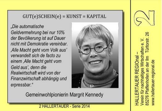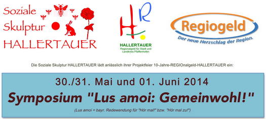 Pfaffenhofen. Der HALLERTAUER, das Regionalgeld für Stadt und Landkreis Pfaffenhofen und die Hallertau, ist ebenso wie „Blumen in der Stadt“ und „InterKulturGarten Pfaffenhofen an der Ilm“ ein Gestaltungsprojekt der Sozialen Skulptur HALLERTAUER und feiert sein 10-jähriges Jubiläum im Rahmen des dreitägigen Symposiums "Lus amoi: Gemeinwohl!", das von Freitag, 30. Mai bis Sonntag, 01. Juni 2014 im Rathausfestsaal und in der Künstlerwerkstatt stattfindet.