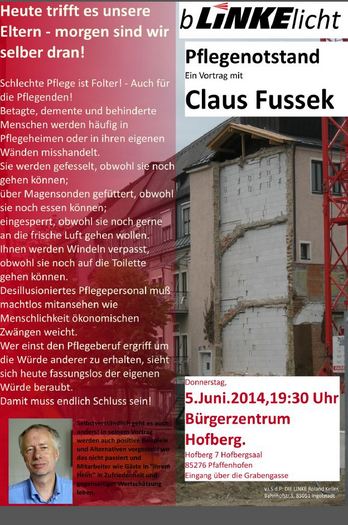 Claus Fussek hält Vortrag zum Pflegenotstand - Am Donnerstag, den 5. Juni findet ein weiterer Vortrag in der Reihe "bLINKElicht"im Hofbergsaal (Bürgerzentrum Hofberg, 19:30 Uhr) statt. Claus Fussek, prominenter Kritiker des Pflegenotstands und Autor (jüngster Titel: "Es ist genug!" - Auch alte Menschen haben Rechte!) wird auch zur Situation in Pfaffenhofen sprechen. Da uns Pflege früher oder später alle angeht, sollten wir ein wachsames Auge für die Schieflagen des Systems haben.
