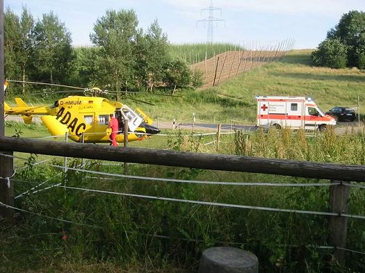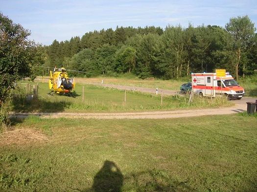 Anwohner eines Anwesens am Dorfausgang Osterwaal wurden durch ihren bellenden Hund auf einen gestürzten Radfahrer auf der Strasse vor ihrem Haus aufmerksam. Sie riefen sofort Polizei und Krankenwagen, später landete ein Rettungshubschrauber in der Pferdeweide der aufmerksamen Bewohnerin, die ihre Tiere vorher noch schnell in Sicherheit brachte und beruhigte. Der verletzte Mann, der erheblich Alkohol intus hatte, wurde ins nächstgelegen Krankenhaus geflogen.