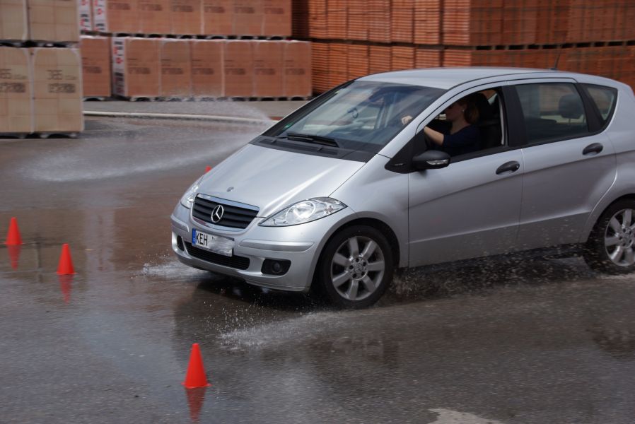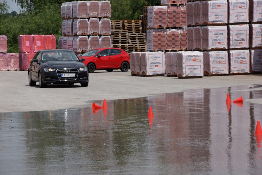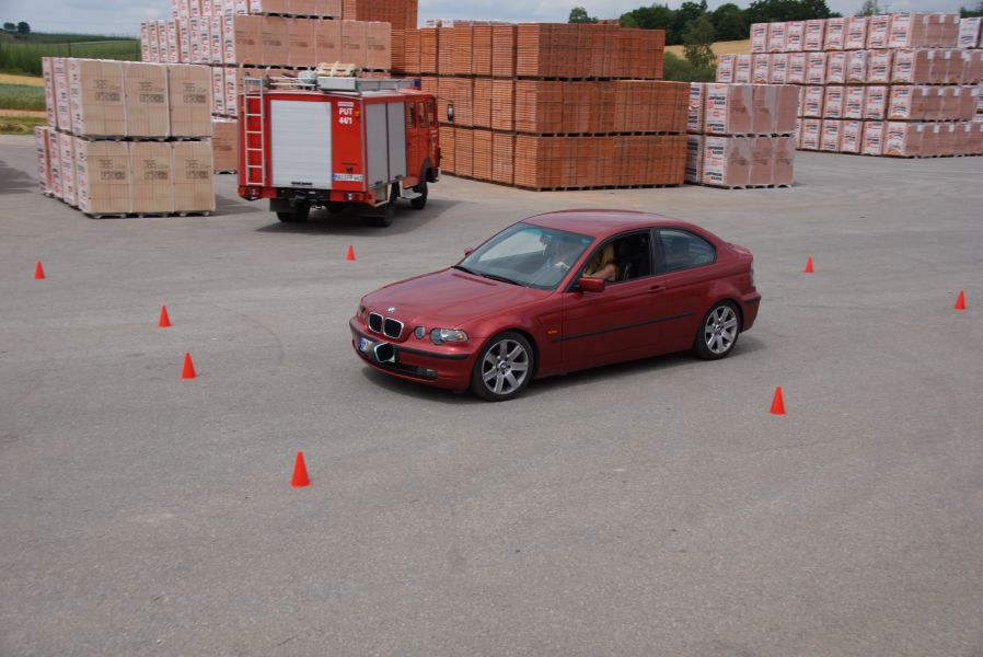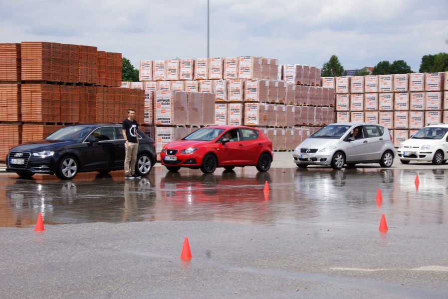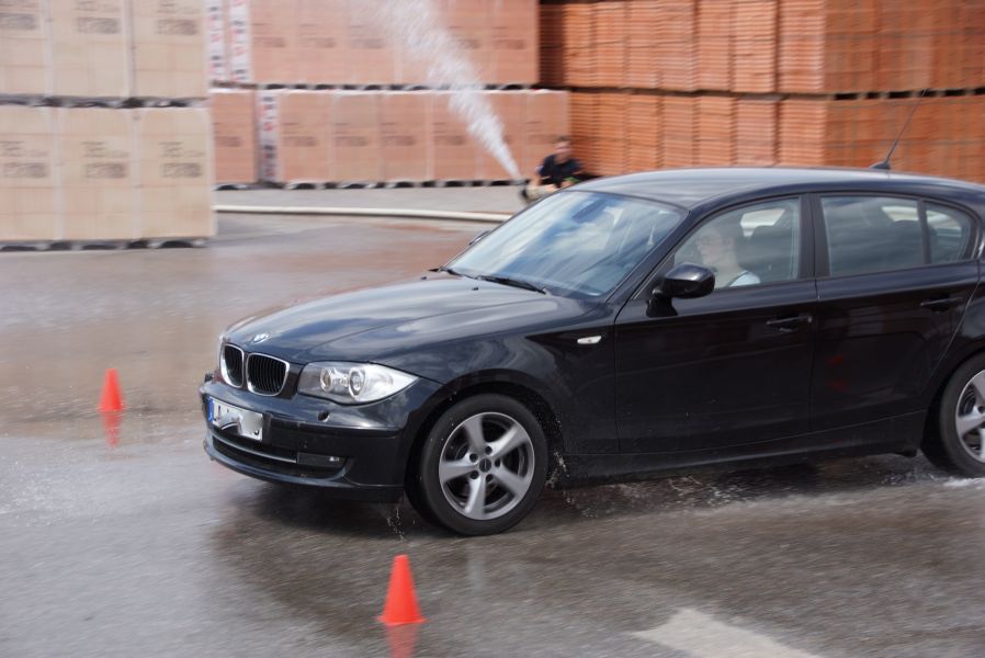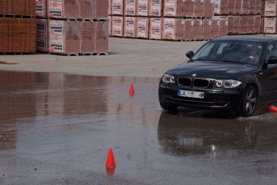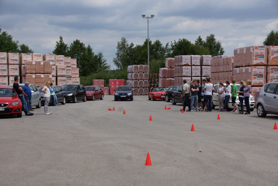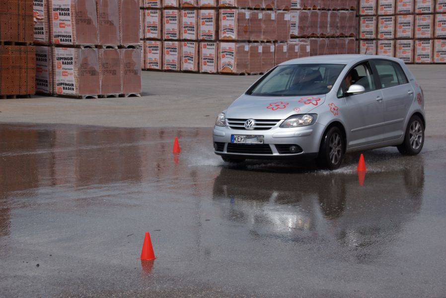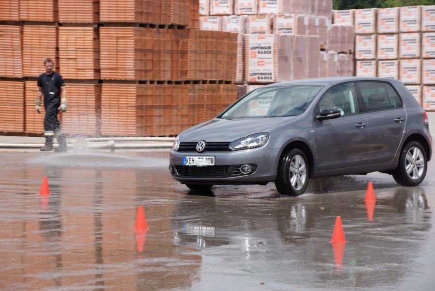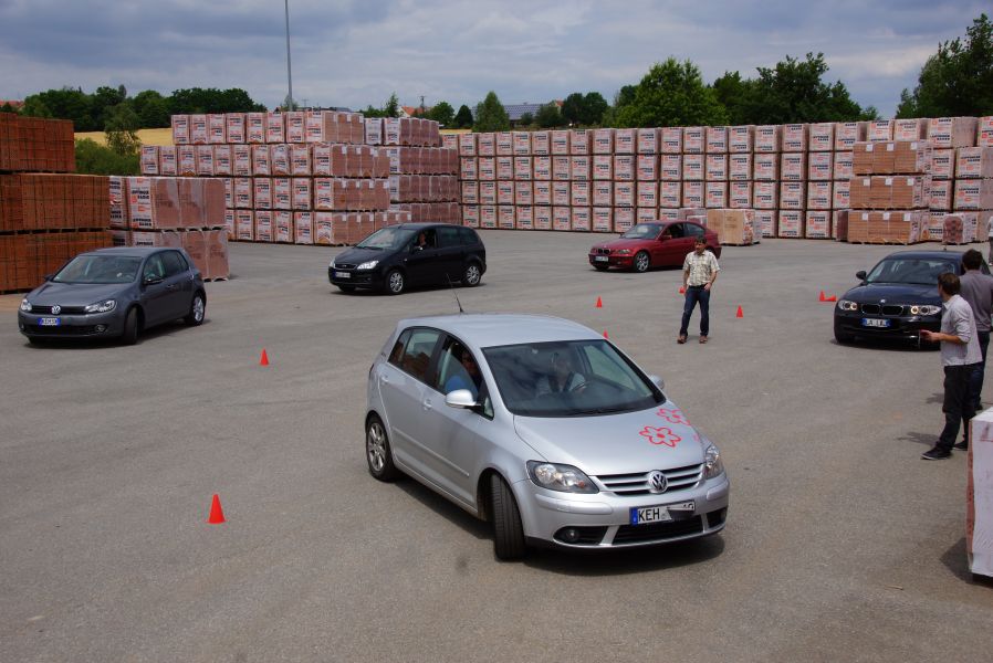 Mit ihren eigenen Autos übten im Anschluss die zwölf Teilnehmer Slalom fahren, Fahrzeugabmessungs- und Parkhausübungen, die von den Trainern erklärt, überwacht und besprochen wurden. Nach der Mittagspause ging es mit Ausweich- und Bremsübungen bei trockener und nasser Fahrbahn weiter, die Bewässerung dafür übernahm die Freiwillige Feuerwehr Puttenhausen.