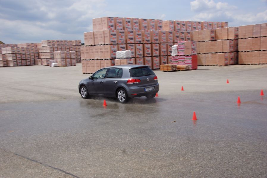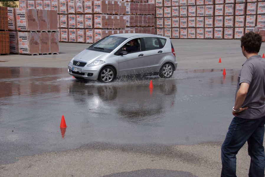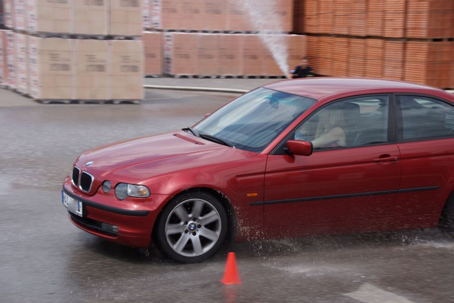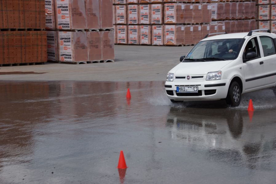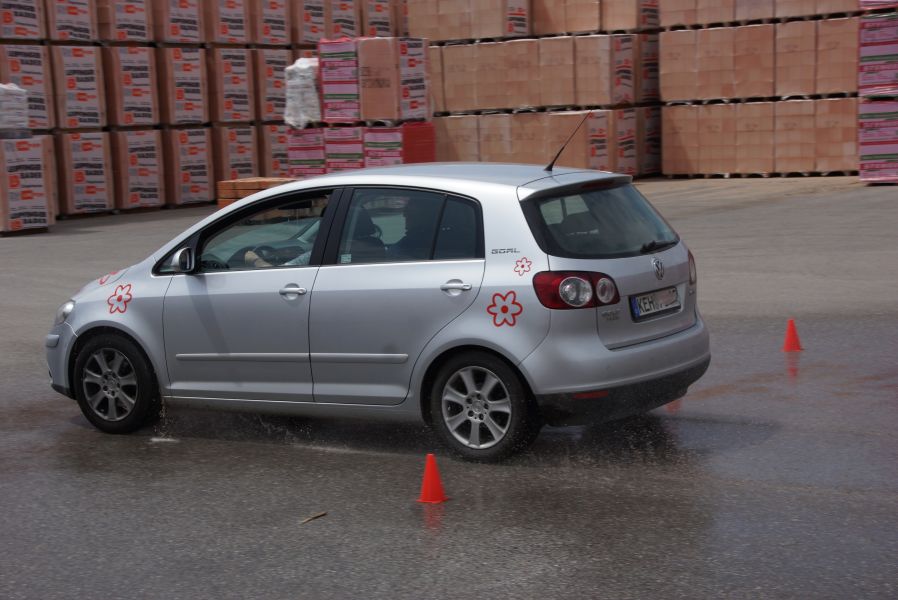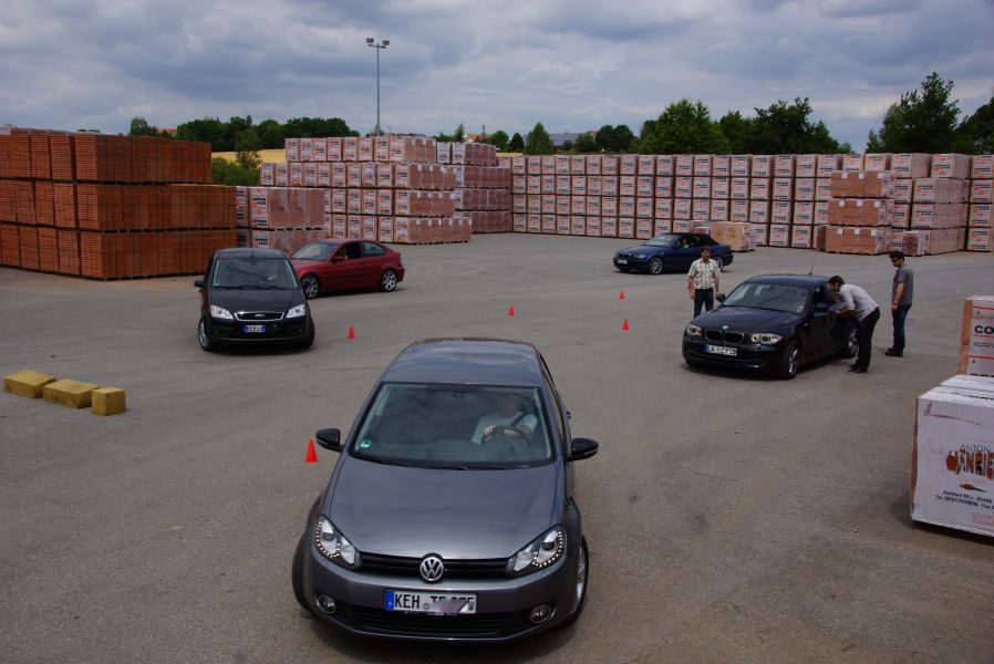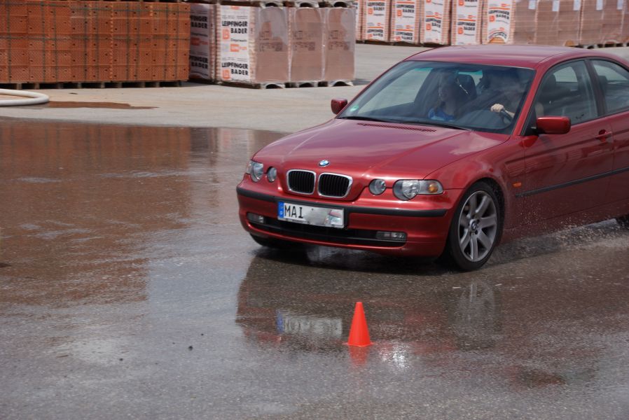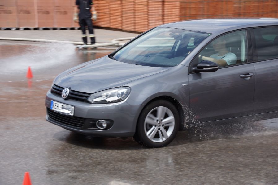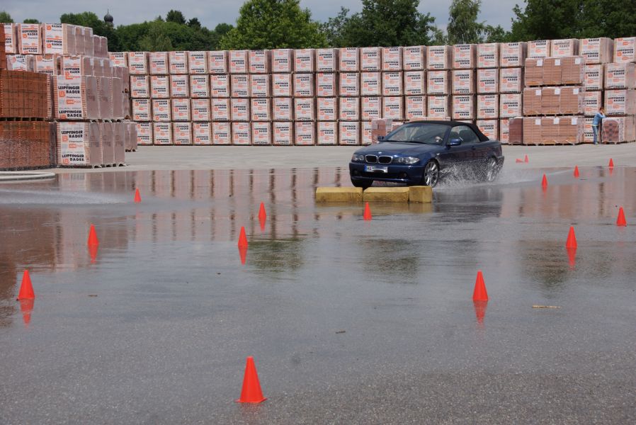 Mit ihren eigenen Autos übten im Anschluss die zwölf Teilnehmer Slalom fahren, Fahrzeugabmessungs- und Parkhausübungen, die von den Trainern erklärt, überwacht und besprochen wurden. Nach der Mittagspause ging es mit Ausweich- und Bremsübungen bei trockener und nasser Fahrbahn weiter, die Bewässerung dafür übernahm die Freiwillige Feuerwehr Puttenhausen.