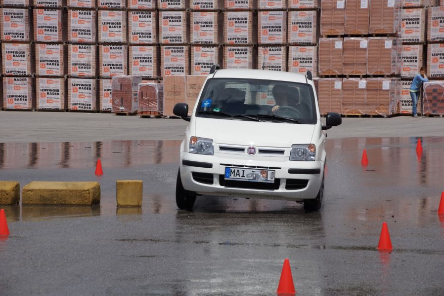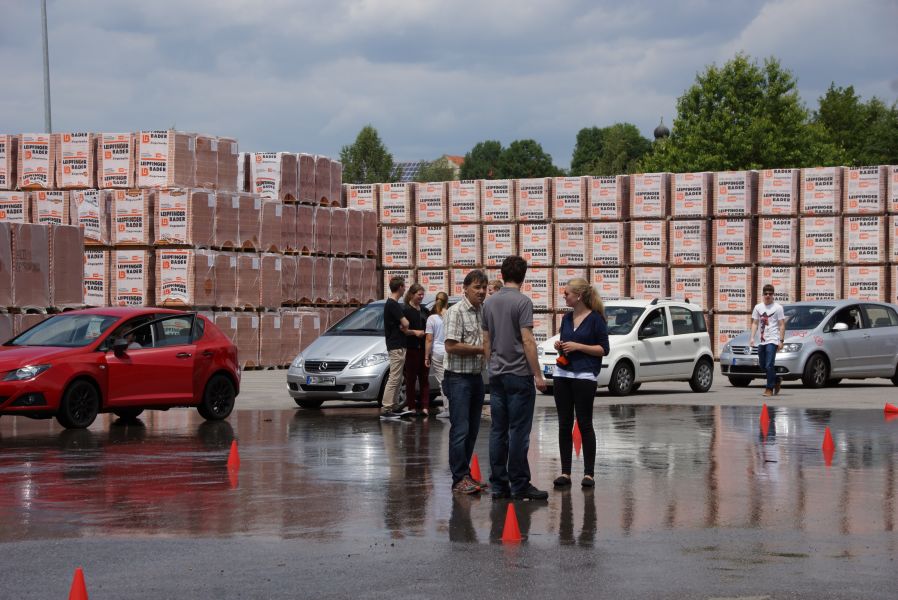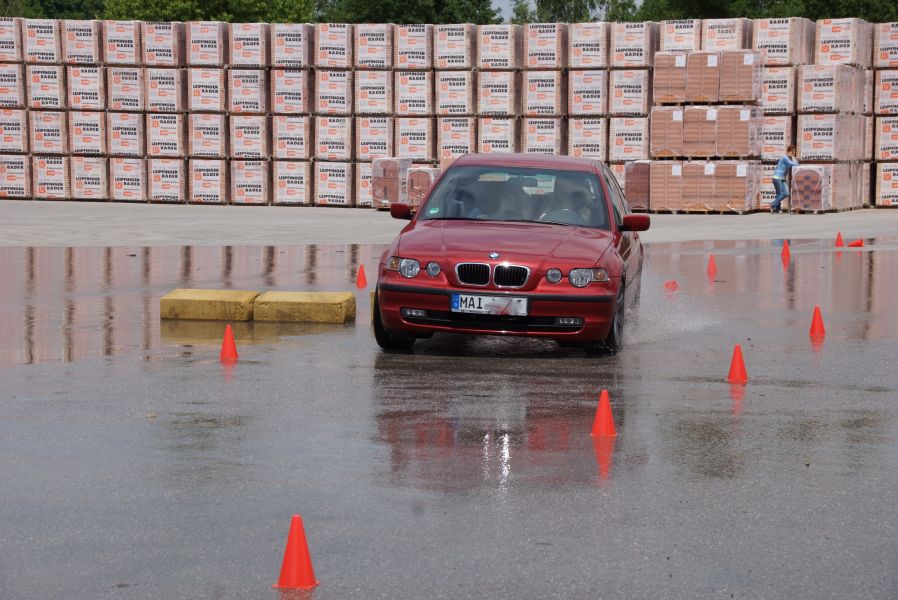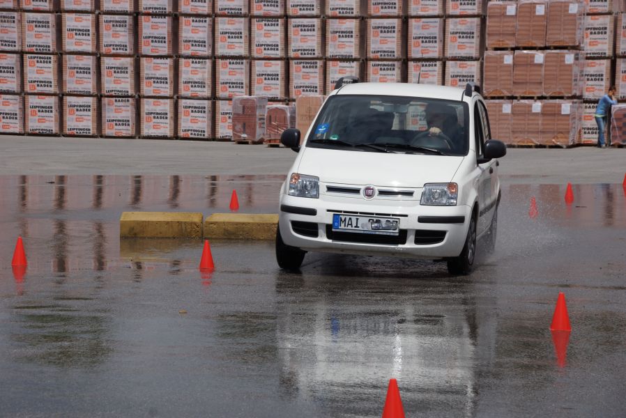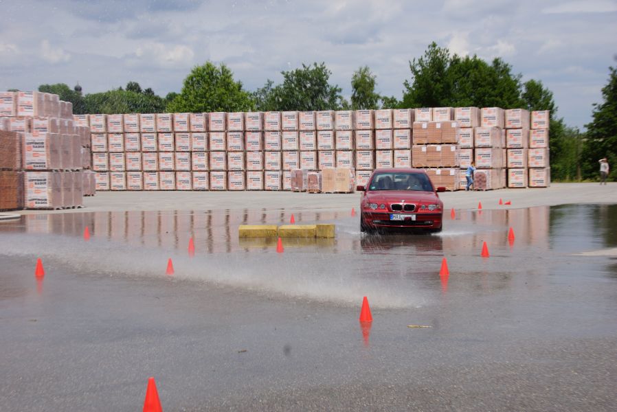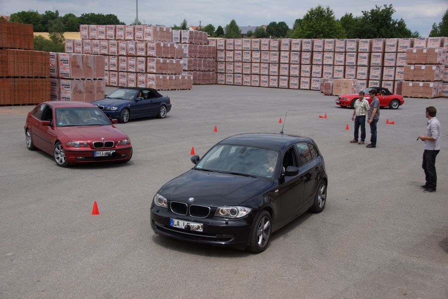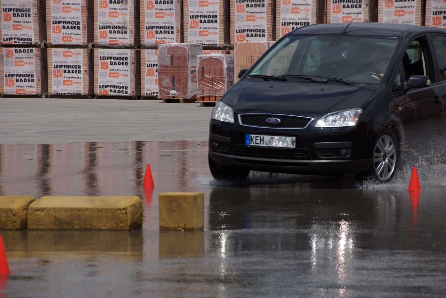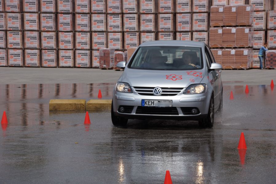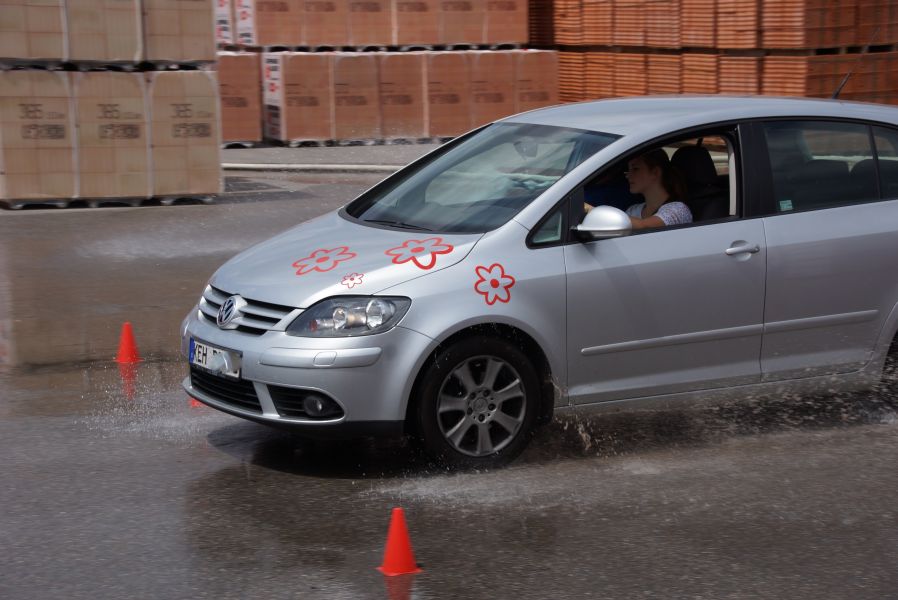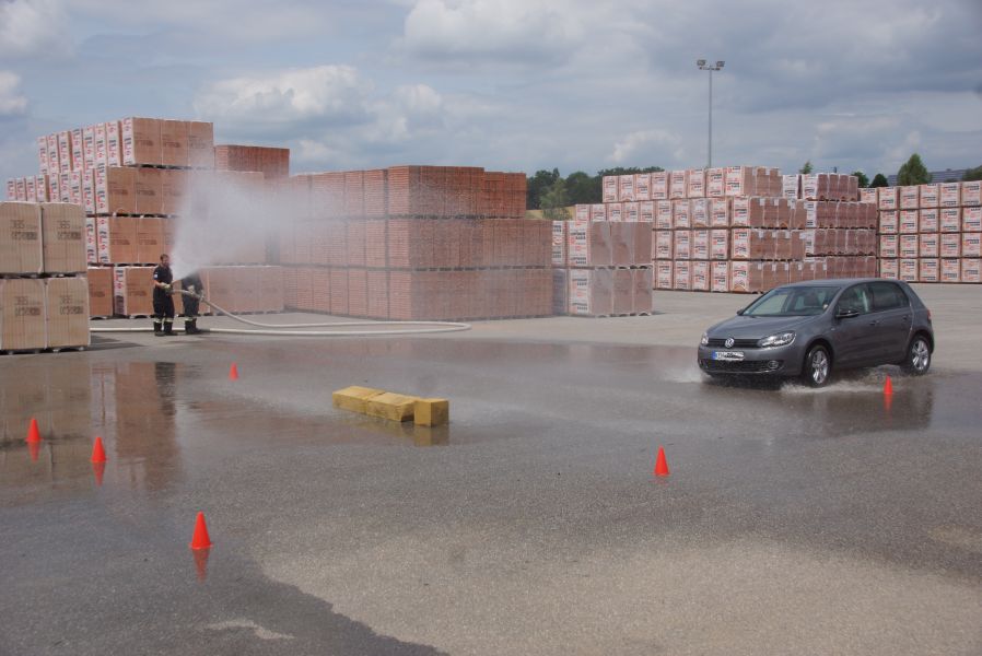 Mit ihren eigenen Autos übten im Anschluss die zwölf Teilnehmer Slalom fahren, Fahrzeugabmessungs- und Parkhausübungen, die von den Trainern erklärt, überwacht und besprochen wurden. Nach der Mittagspause ging es mit Ausweich- und Bremsübungen bei trockener und nasser Fahrbahn weiter, die Bewässerung dafür übernahm die Freiwillige Feuerwehr Puttenhausen.