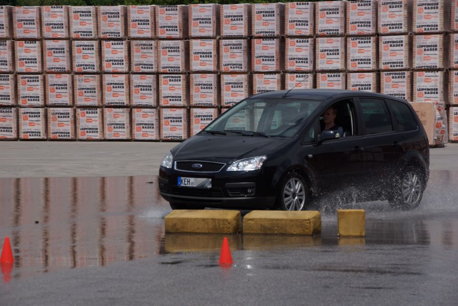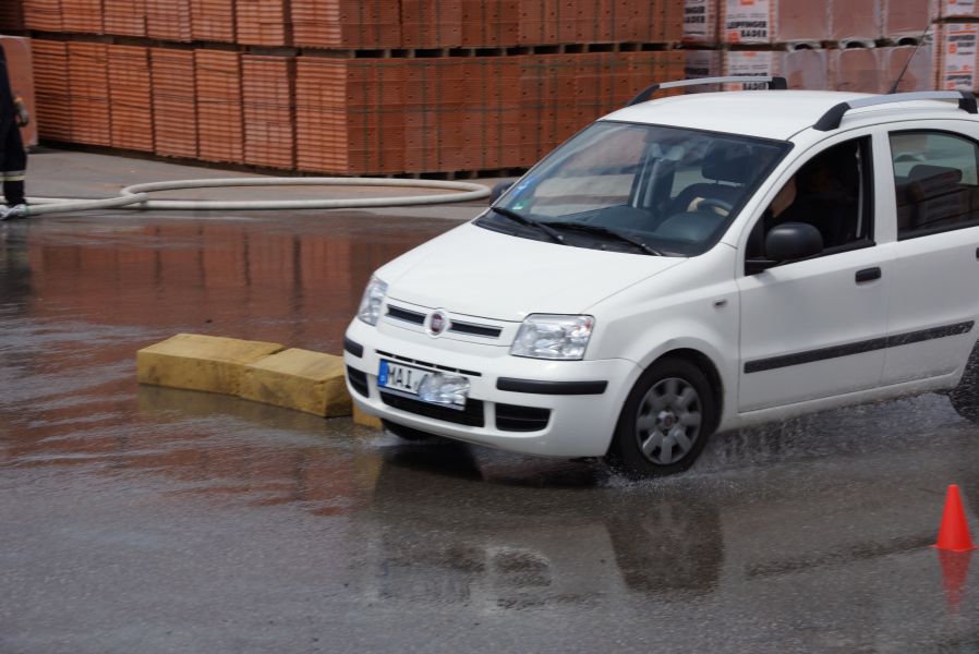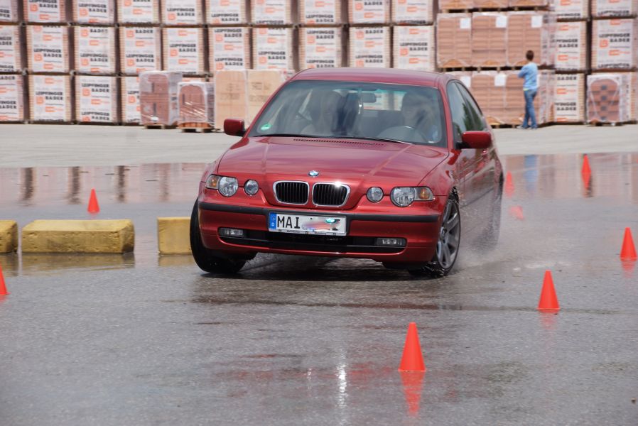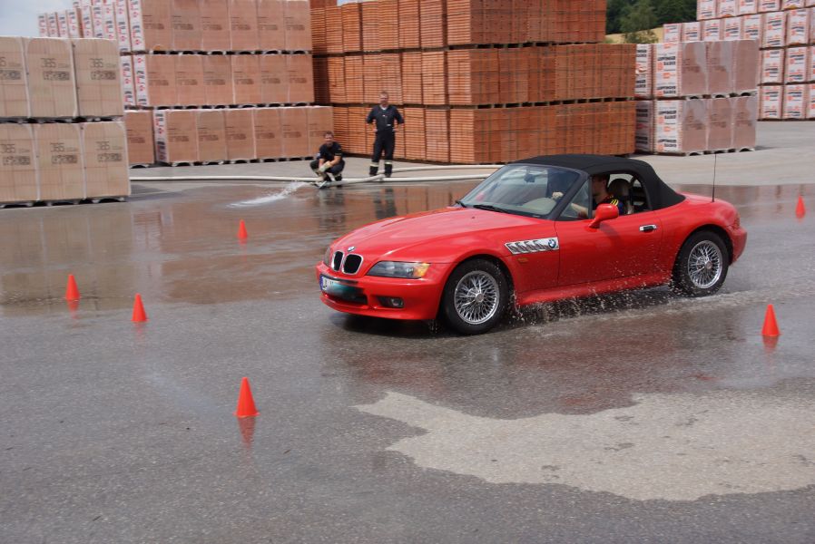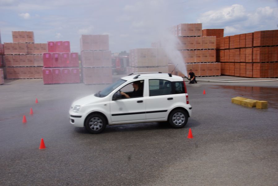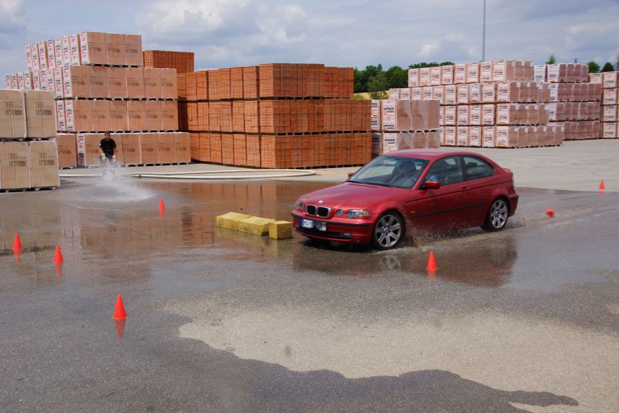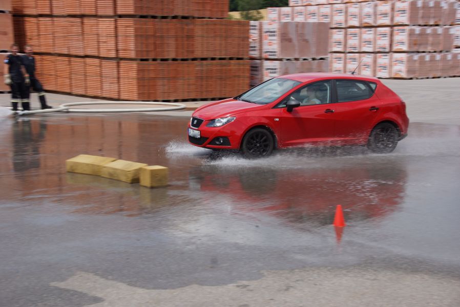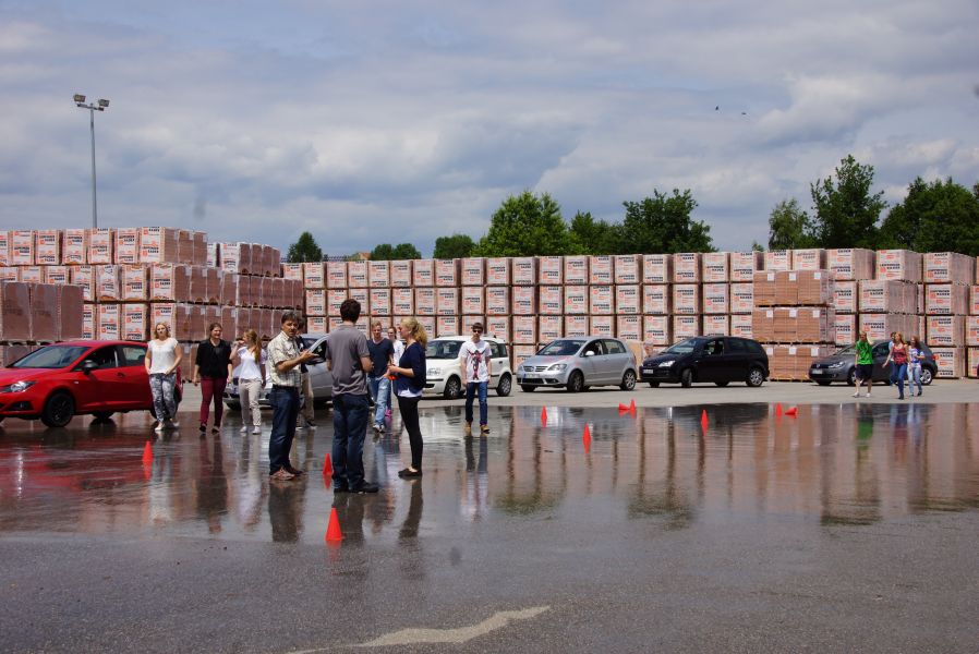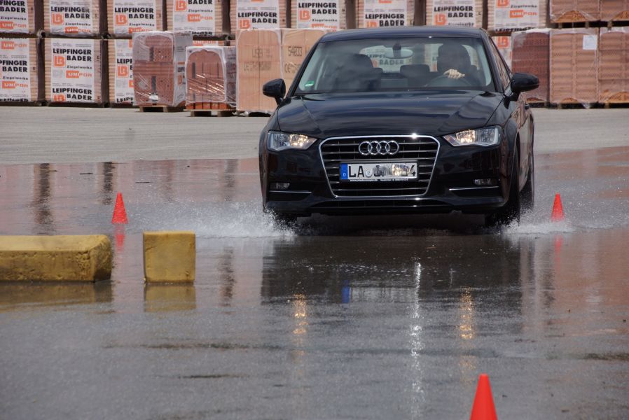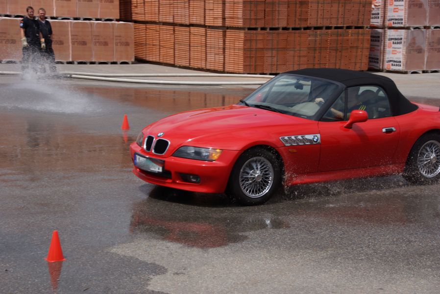 Mit ihren eigenen Autos übten im Anschluss die zwölf Teilnehmer Slalom fahren, Fahrzeugabmessungs- und Parkhausübungen, die von den Trainern erklärt, überwacht und besprochen wurden. Nach der Mittagspause ging es mit Ausweich- und Bremsübungen bei trockener und nasser Fahrbahn weiter, die Bewässerung dafür übernahm die Freiwillige Feuerwehr Puttenhausen.