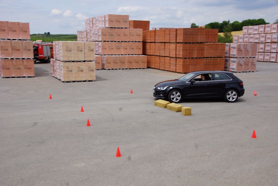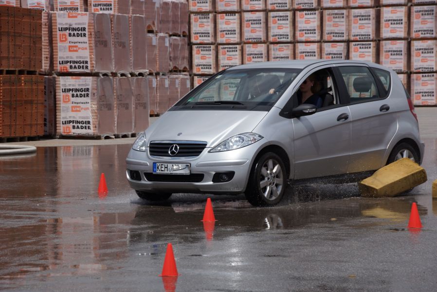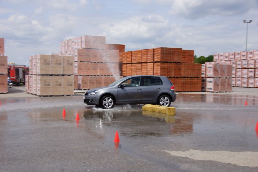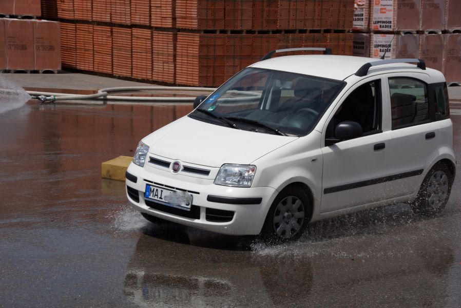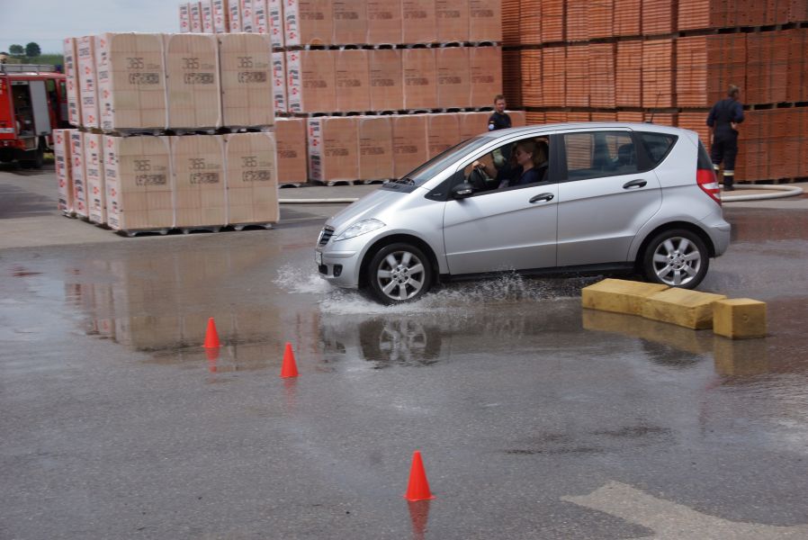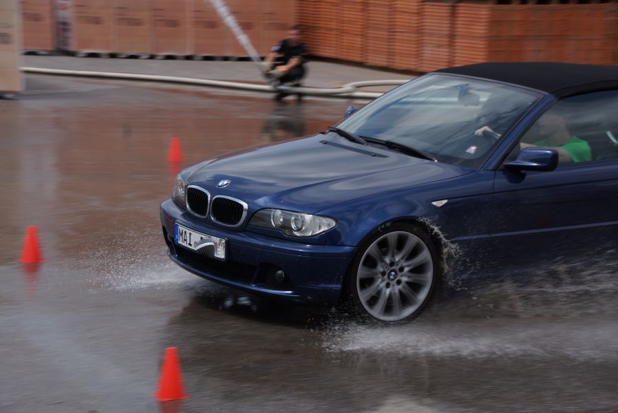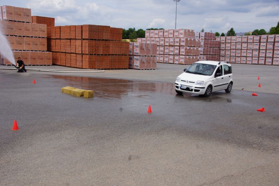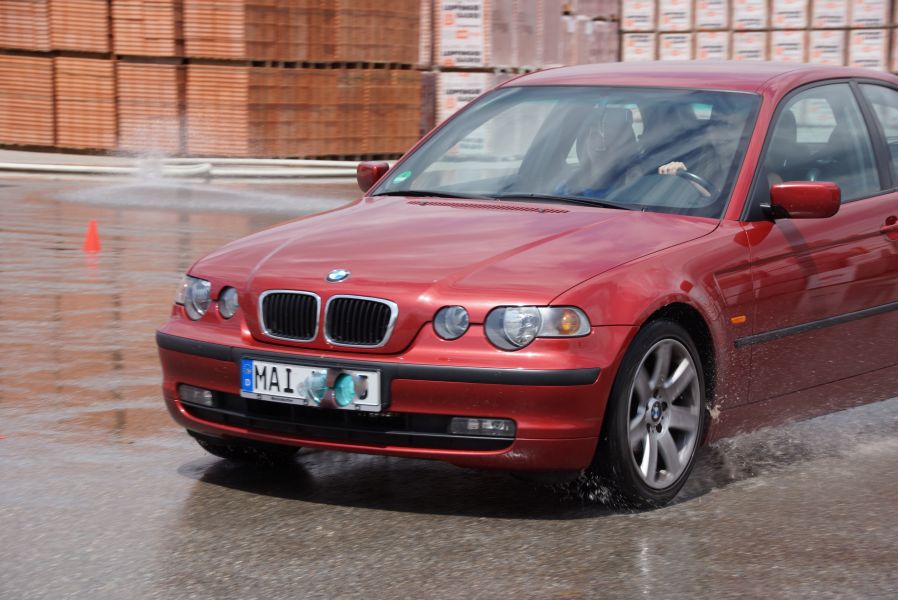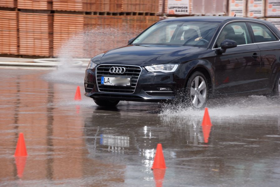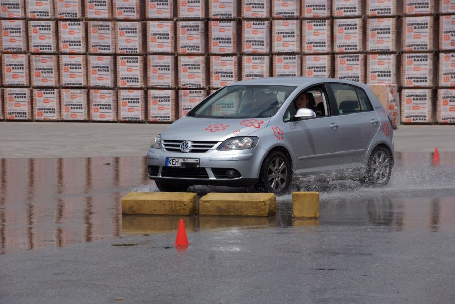 Mit ihren eigenen Autos übten im Anschluss die zwölf Teilnehmer Slalom fahren, Fahrzeugabmessungs- und Parkhausübungen, die von den Trainern erklärt, überwacht und besprochen wurden. Nach der Mittagspause ging es mit Ausweich- und Bremsübungen bei trockener und nasser Fahrbahn weiter, die Bewässerung dafür übernahm die Freiwillige Feuerwehr Puttenhausen.