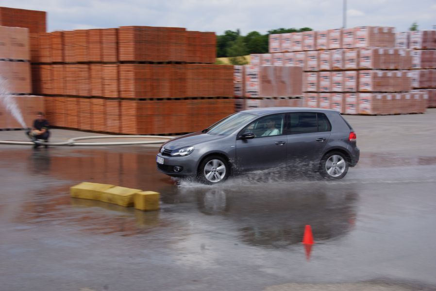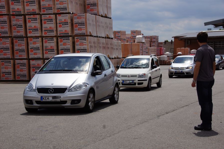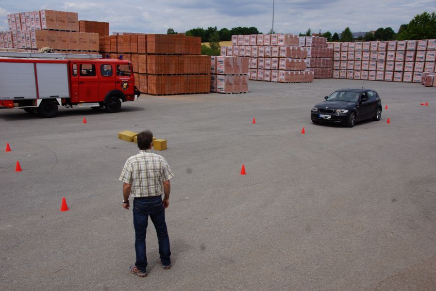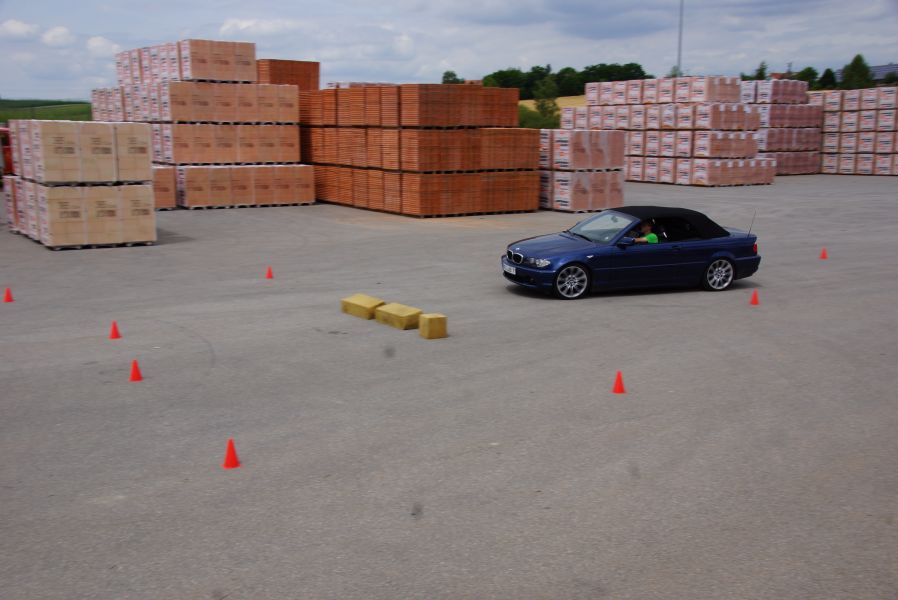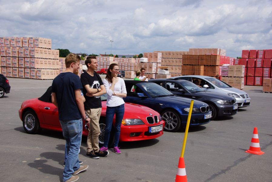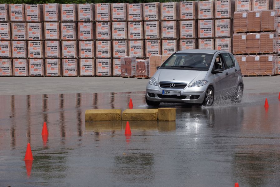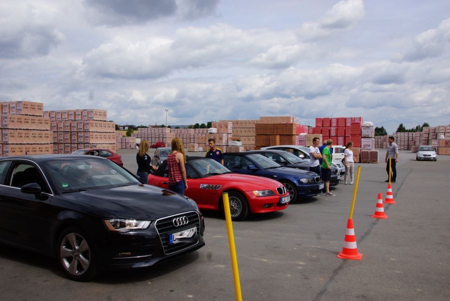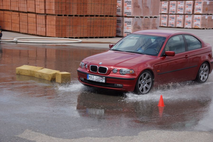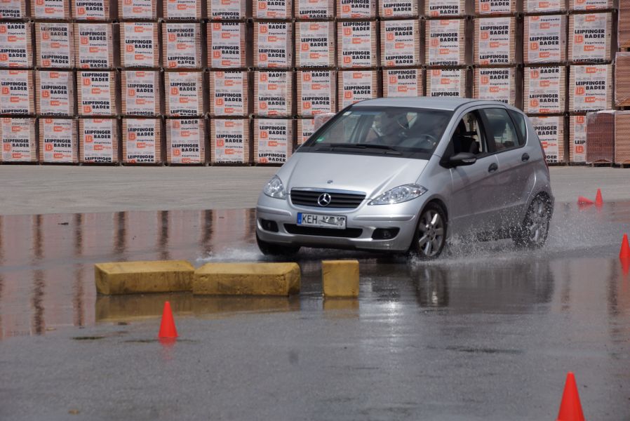 Mit ihren eigenen Autos übten im Anschluss die zwölf Teilnehmer Slalom fahren, Fahrzeugabmessungs- und Parkhausübungen, die von den Trainern erklärt, überwacht und besprochen wurden. Nach der Mittagspause ging es mit Ausweich- und Bremsübungen bei trockener und nasser Fahrbahn weiter, die Bewässerung dafür übernahm die Freiwillige Feuerwehr Puttenhausen.