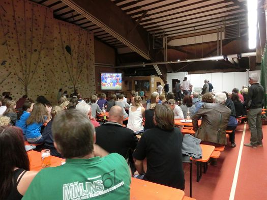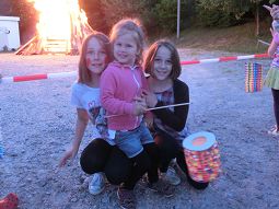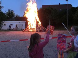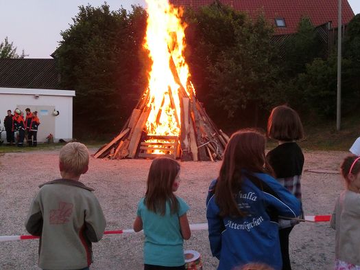 Viele Kinder hatten Lampions dabei und waren rund um das Sportgelände gezogen. Um 9 Uhr waren dann die Interessen klar ersichtlich: in der Sporthalle war eine große Leinwand aufgebaut und dort versammelten sich fast alle Erwachsenen zum Public Viewing. Draußen am Feuer schauten nur die Kinder und einige Mütter den riesigen, brennenden Holzhaufen an. Tradition hin oder her - in diesem Fall war Fußball wichtiger.