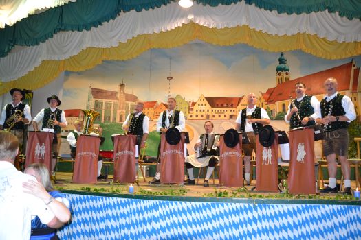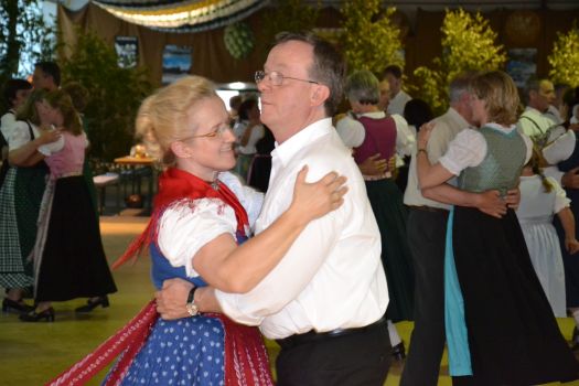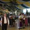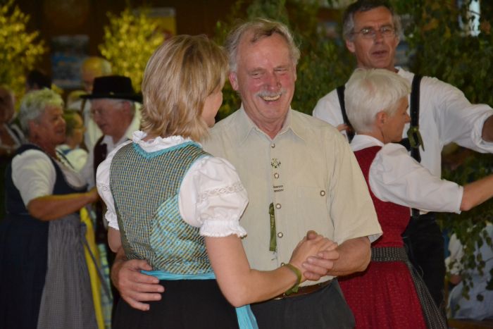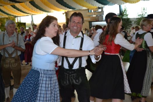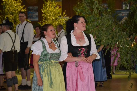 Dabei war das in Tracht erschienene Publikum altersmäßig ganz gut gemischt und tanzte in der schön mit vielen Birken dekorierten Volksfesthalle um eine in der Mitte der Halle aufgestellte Birke mit einer Rundbank herum. Als Beispiele für die verschiedenen Tänze sollen hier genannt werden: Landler, Kikeri, Zwiefacher, Chiemgauer Dreher, Rehberger Landler, Marschierboarisch, Kreuzpolka, Studentenpolka, Münchner Francaise, D schö Marire oder der Körbletanz. Dazu hatten viele Frauen ihr Körble mitgebracht, die reichlich verziert auf ihren Einsatz warteten. Und damit niemand verhungern oder verdursten sollte, war auch für ausreichend Essen und Trinken gesorgt, denn in der Halle war es durch die sommerliche Hitze recht warm und die Tänzerinnen und Tänzer in ihren Trachten kamen schnell ins Schwitzen.