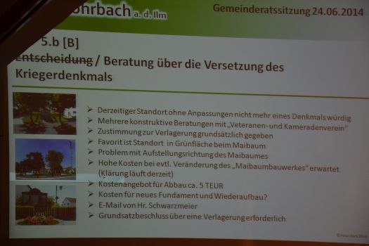 In einer Fotomontage hatte Bürgermeister Keck das Denkmal auf drei Standorte gerückt, unter anderem auf die Grünfläche beim Maibaum, vor das Anwesen Abel oder auf der jetzigen Fläche, nur etwas weiter nach hinten zurückversetzt. Doch aus dem Gemeinderat kamen weitere Vorschläge wie gegenüber der alten Kirche, („das ist aber mein Grundstück“, so Hans Vachal), bei der neuen Kirche, beim Rathausplatz oder auf dem Friedhof. Aber alle Vorschläge haben immer einen Nachteil: entweder wirkt das Denkmal „abgeschoben“ (Friedhof, Kirchen, Anwesen Abel) oder das Maibaumbauwerk müsste gegebenenfalls umgebaut werden, da sich sonst Maibaumaufstellung und Denkmal stören könnten. Die Gemeinderäte beschlossen, dass das Denkmal auf jeden Fall verlegt werden müsste, und dass Kosten entstehen, war allen klar. Sie einigten sich, die verschiedenen Möglichkeiten noch einmal mit dem Kameradenverein zu besprechen und in einer nächsten Sitzung darüber zu entscheiden. Als Hinweis verlas Bürgermeister Keck eine E-mail des örtlichen Heimatpflegers, der darauf hinwies, dass eine Verlagerung vor 25 Jahren einen Sturm der Entrüstung hervorgerufen hätte. Er plädierte dafür, den jetzigen Standort nicht einer Straßenplanung zu opfern.