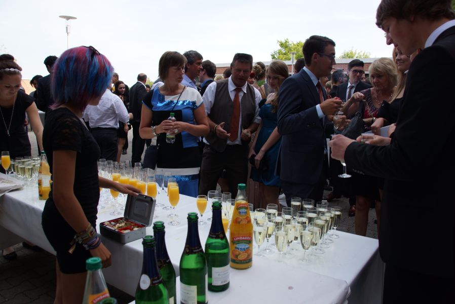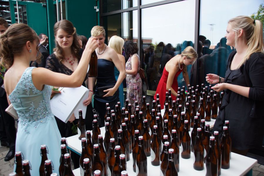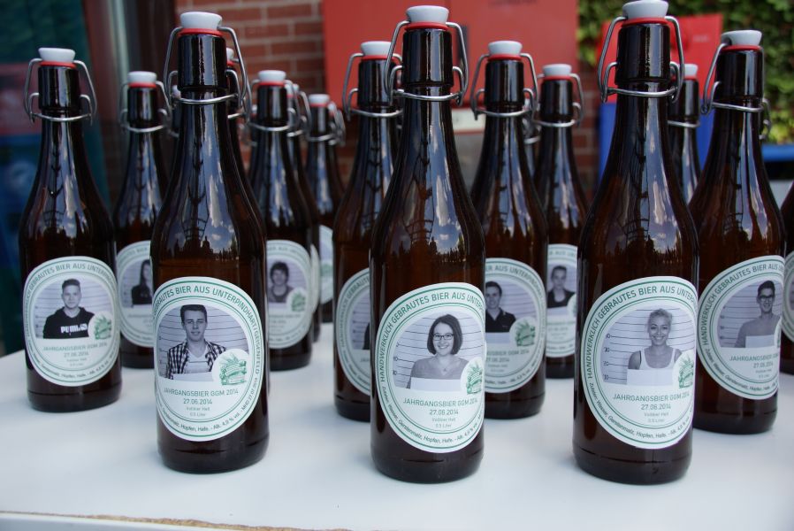 Auf dem Schulhof warteten schon Sekt bzw. alternativ Orangensaft für die ganze Gesellschaft. Die Schulabgänger jedoch, hatten sich selber noch ein ganz besonderes Geschenk gemacht. Für jeden Stand eine Flasche selbst gebrautes Bier des Landgasthofes Rockermeier bereit, dass sie höchstpersönlich in Flaschen mit ihrem Foto, abgefüllt hatten.