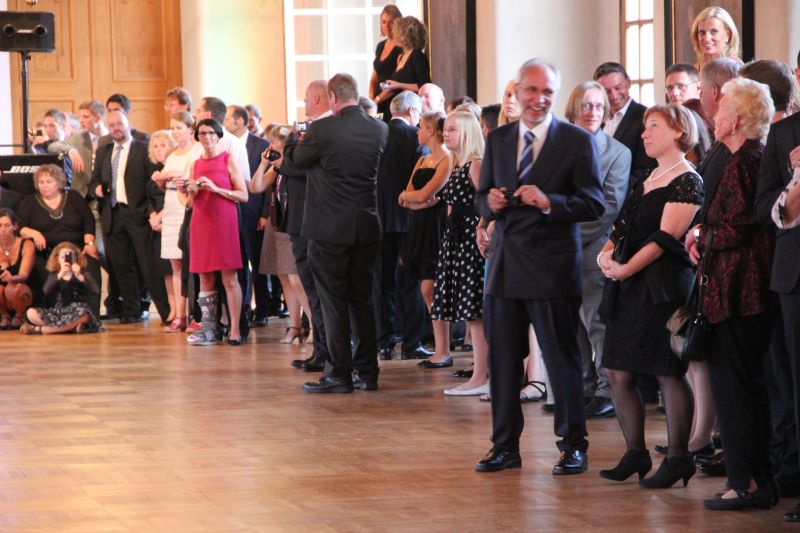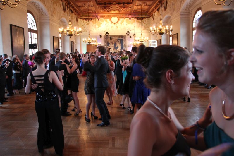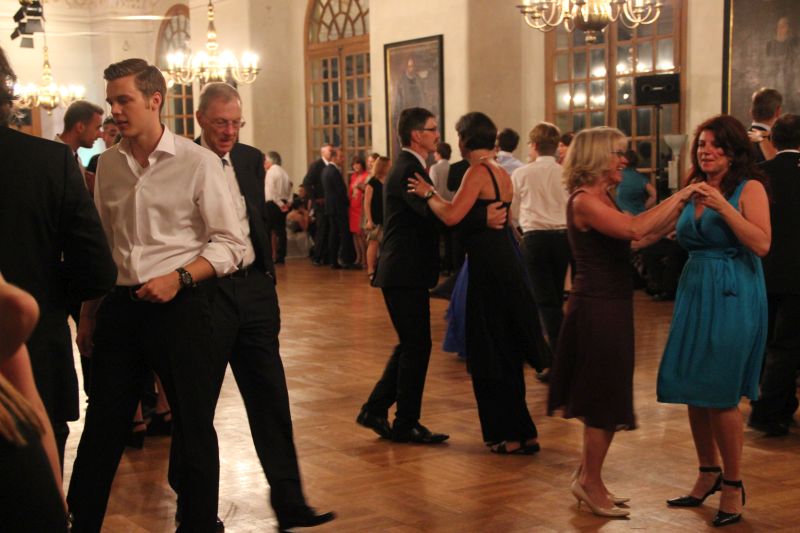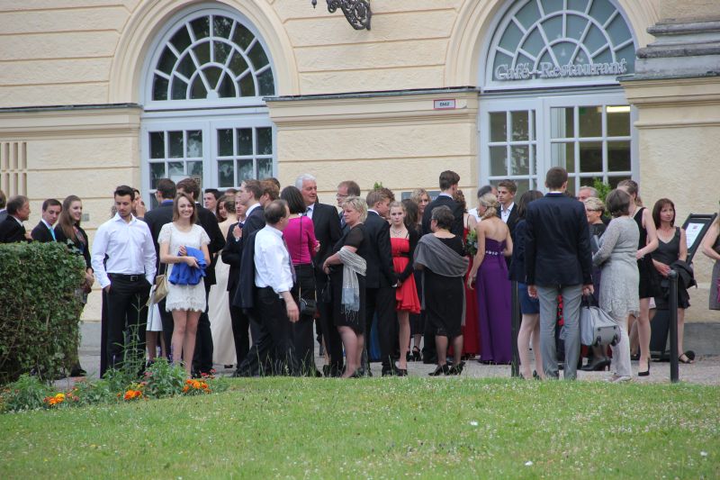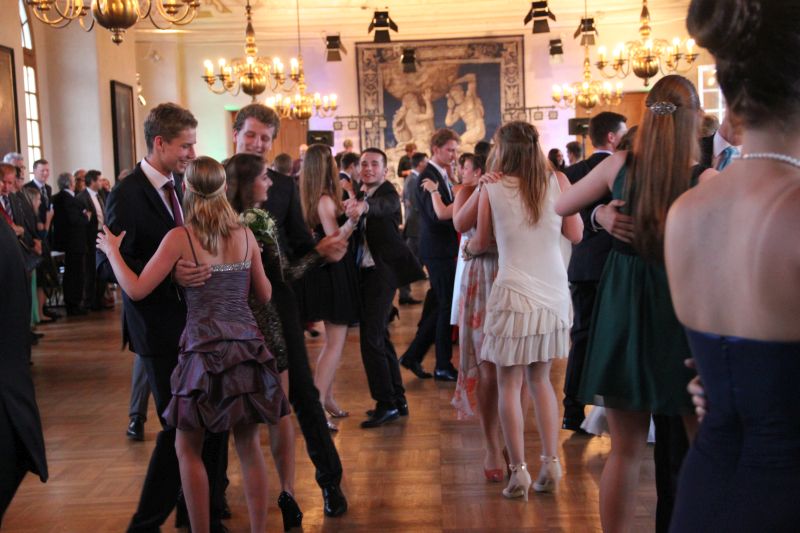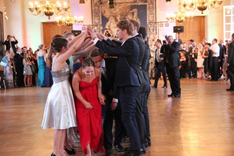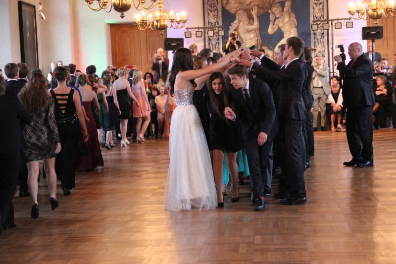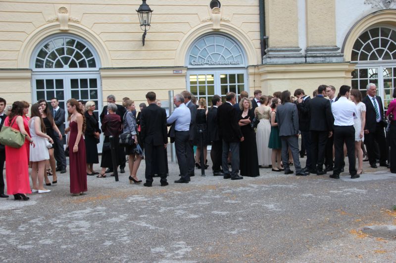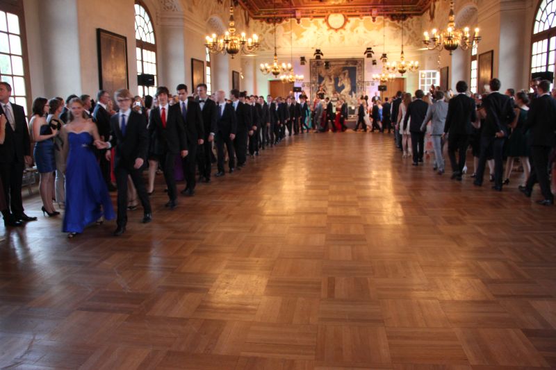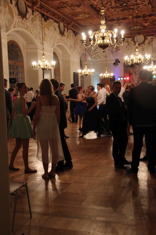 "In den einmaligen Räumlichkeiten des Schlosses Dachau werden seit Jahrhunderten rauschende Feste ausgerichtet, die in die Geschichte eingegangen sind." So heißt es in der Werbebroschüre der Schlossgastronomie. Zumindest für den Abi-Jahrgang 2014 des Schyren-Gymnasiums wird auch dieses Fest in die Geschichte eingehen. Mit einem Einzug der Abiturientinnen und Abiturienten begann die Abschlussparty, veranstaltet von der vhs-Dachau und Stephan Pokorny, die dann nach einer eher klassischen "Eintanzphase" letztendlich in einen rhythmischen und Foxtrott-getriebenen, in jedem Fall aber rauschenden Tanzabend überging, bei dem kaum jemand auf den wenigen bereitgestellten Stühlen sitzen blieb. Wem es im Festsaal dann aber doch zu heiß wurde, der begab sich auf die angrenzende Terrasse mit dem wunderschönen Blick in einen der reizvollsten Schlossparks Bayerns und weit über die Dächer Münchens bis in das Alpenvorland hinaus.