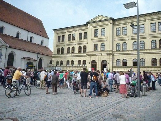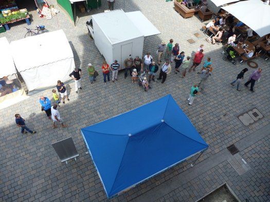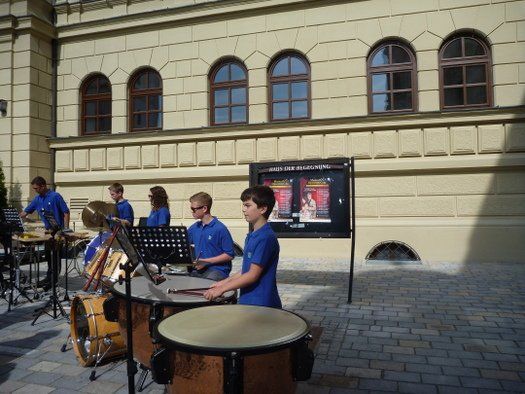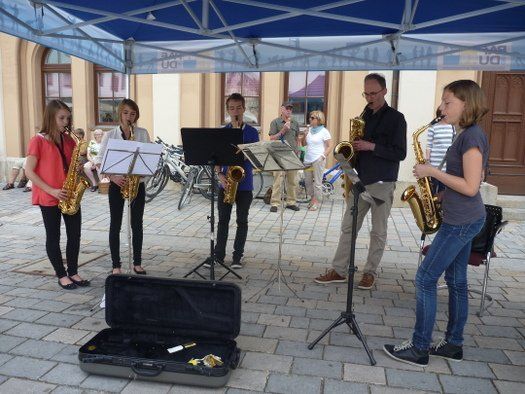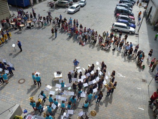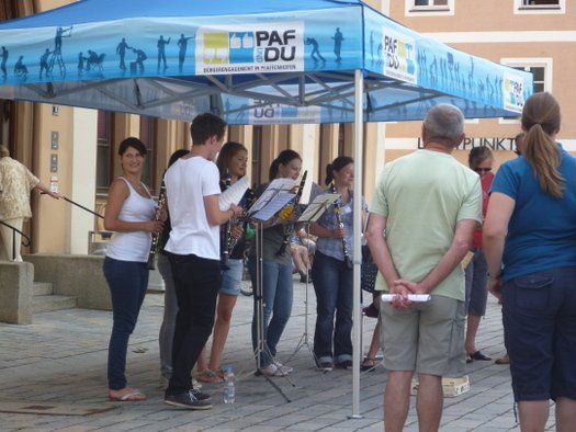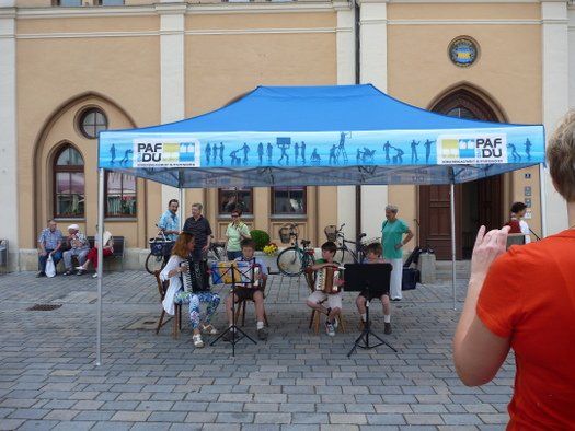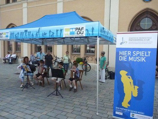 Geheiratet und musiziert wurde manchmal sogar gleichzeitig. Die städtische Musikschule Pfaffenhofen hatte ihren jährlichen Tag der offenen Tür. Mit viel LIVE Musik in den Probenräumen wurde die zukünftige Kundschaft gelockt. Instrumente aller Art standen zum Ausprobieren bereit, die Lehrkräfte halfen zwar noch bei der ersten Handhabung, aber dann war jede/er selbst Meister seiner eigenen, meist schrägen Töne. Einzelne Instrumentalgruppen gaben vor dem Rathaus im schattigen Pavillon von PAFundDU, ihr Gelerntes zu Gehör, die Stadt war voller Musik.