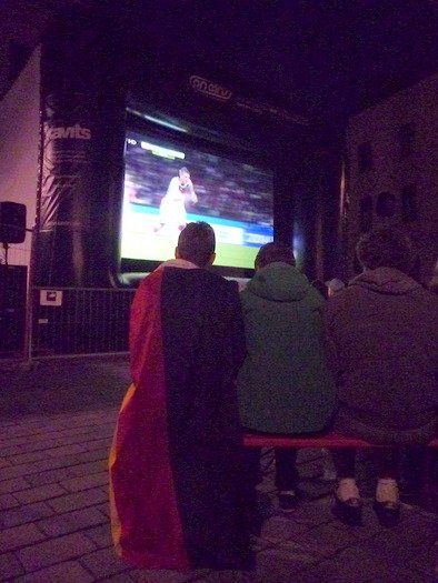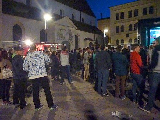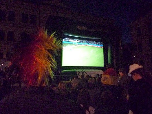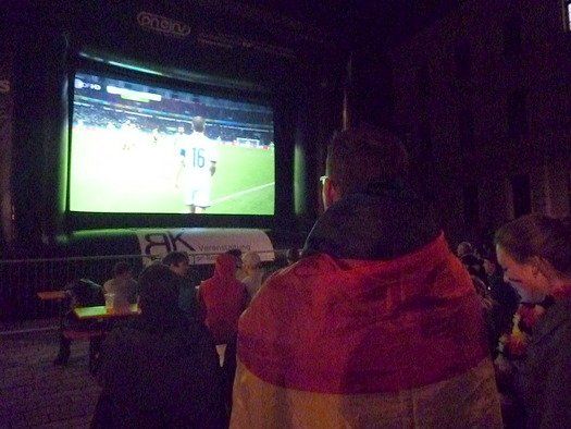 Der Ort für das öffentliche Fernsehschauen ist gut gewählt, er liegt gleich zwischen zwei Kirchen, und göttliche Hilfe war teilweise durchaus nötig bei diesem Achtelfinalspiel. Das Publikum war pünktlich zur blauen Stunde erschienen und machte sich eher auf ein Schützenfest bereit. Weit gefehlt, die Algerier hielten fleißig dagegen und Manuel Neuner hat die Wiedergeburt des Libero geliefert.