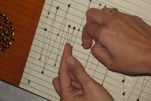 Dieses Saitenzupfinstrument kann sogar ohne herkömmliche Notenkenntnisse gespielt werden, da dafür eigens eine einfache, auf das Wesentliche reduzierte Notenschrift entwickelt worden ist. Denn zwischen Saiten und Resonanzkörper geschobene Notenschablonen, machen die Noten quasi begreifbar.