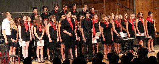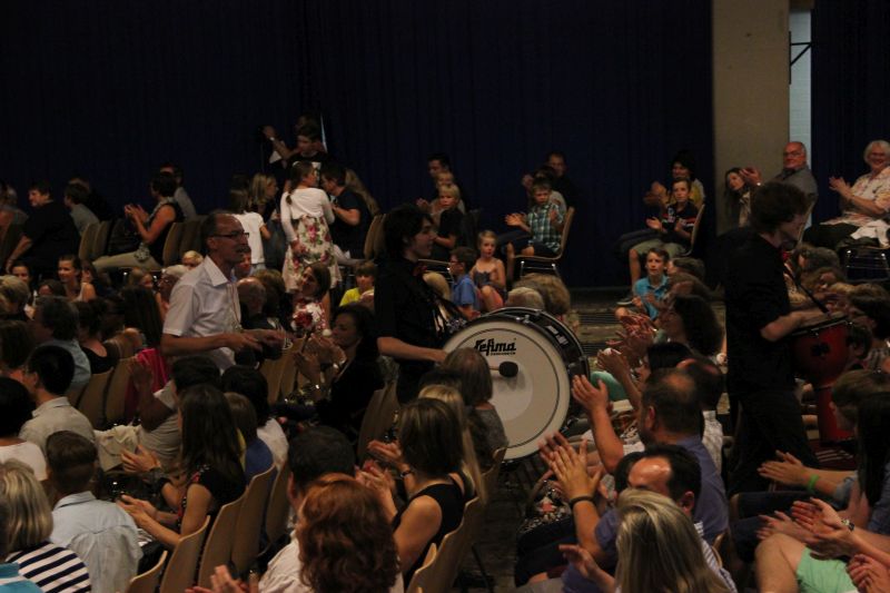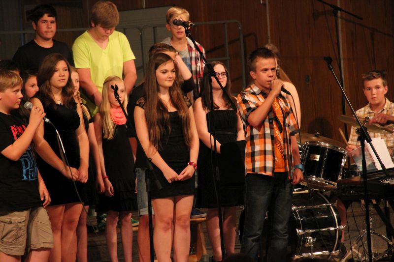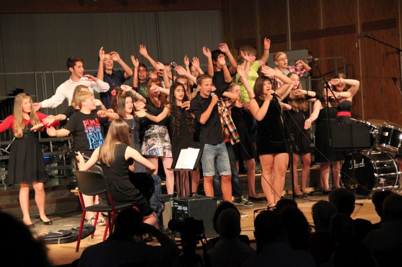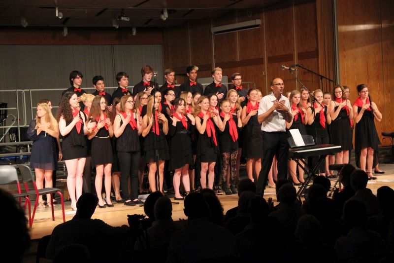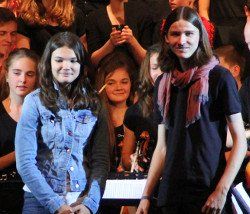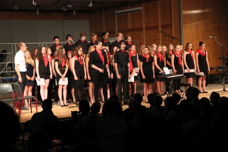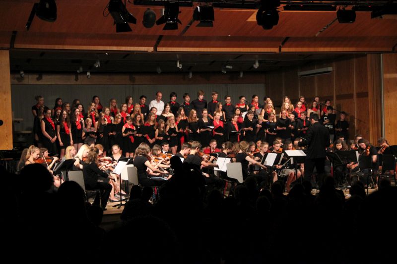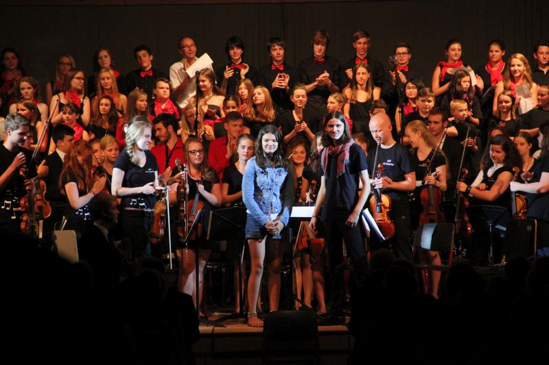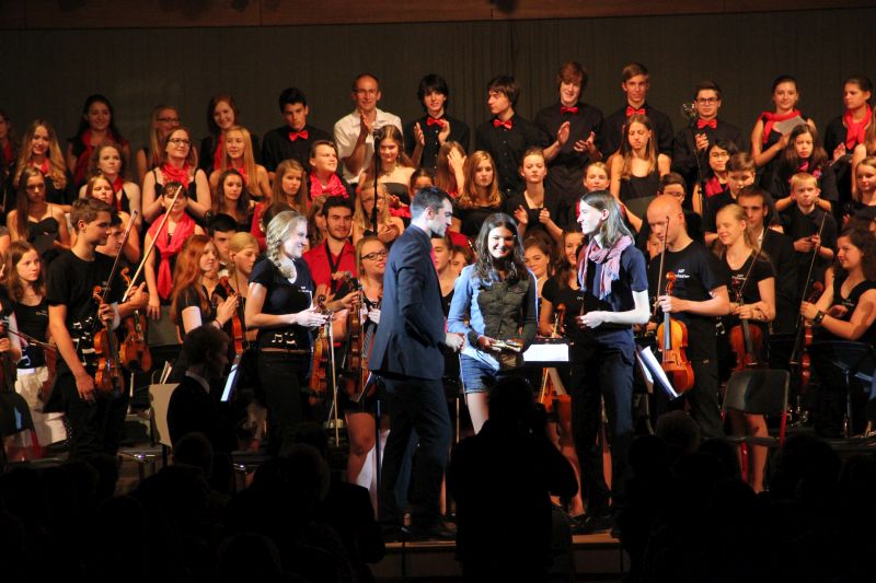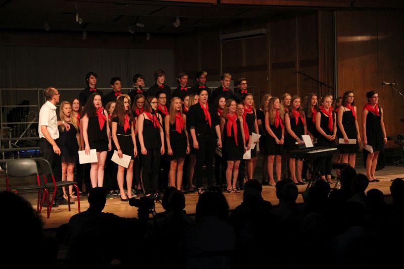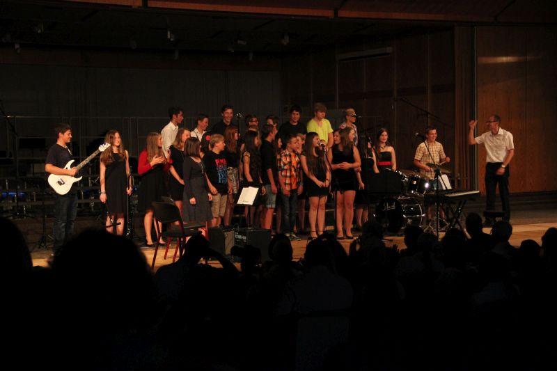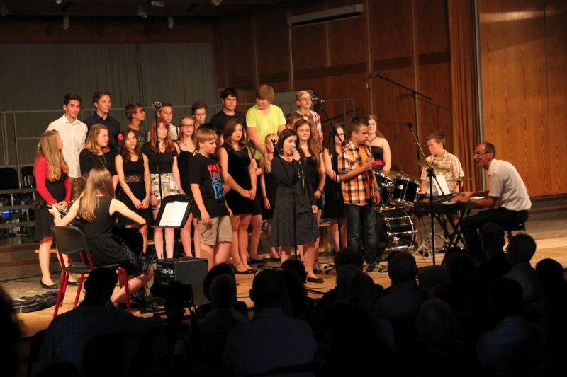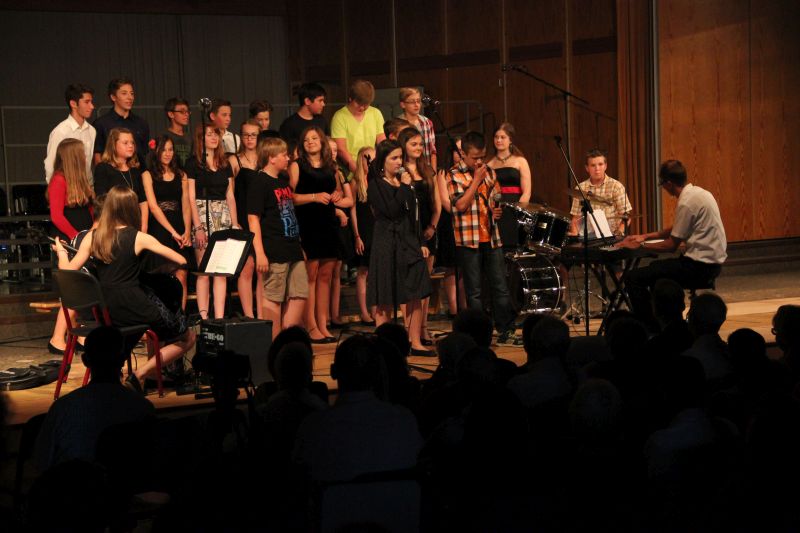Höhepunkt und zugleich Abschluss des Sommerkonzerts 2014 des Schyren-Gymnasiums war dann eine Hommage an die 50 Jahre, die die Schule nun existiert. "50 Years", eine Hymne zum Schuljubiläum, komponiert von zwei SGP-Schülern. Kilian Brock (Musik) und Tabea Kretzschmar (Text), beide rechts im Bild, hatten sich zusammengetan, diesen Song entwickelt und durften nun im angemessenen Rahmen die Welturaufführung erleben und begleiten. Die Begeisterung des Publikums kannte am Ende dieses Konzertabends keine Grenzen. Wer solche Musiktalente in den Chören, Orchester-Formationen, Big Band und nun auch kompositorisch aus seinen Reihen rekrutieren kann, der macht garantiert alles richtig im Bereich der musikalischen Entwicklung und Förderung. Ein Lob muss man aber unbedingt auch den beteiligten Lehrkräften aussprechen, die mit einem enormen Engagement und persönlichem Einsatz diese Talente erst zusammenführen und zu einer Einheit formen.