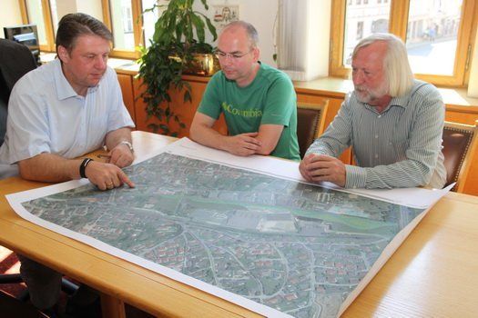 Lothar Hübner und Ralf-Michael Umlauf erläuert gemeinsam mit Bürgermeister Jens Machold die weiter Bauphase