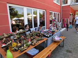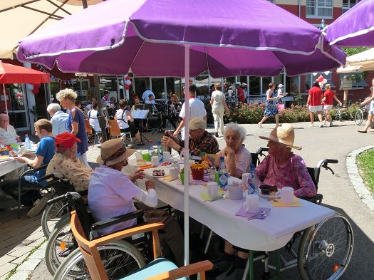 Bei strahlendem Sonnenschein und heißen Temperaturen fand das Sommerfest im Seniorenheim Kursana in Au statt. Bis auf die, extra abgesperrte, Straße reichten Tische und Bänke. Schirme boten zwar Schatten, aber darunter wurde es dennoch ziemlich heiß.
