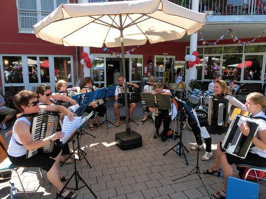 "Alles können wir zwar möglichst perfekt vorbereiten, aber auf das Wetter haben wir leider keinen Einfluß", so Direktorin Mirjam Fink in ihrer Begrüßungsansprache. Es gab aber reichlich kühle Getränke und ein großes Kuchenbuffet, so dass man es gut aushalten konnte. Die rührigen Angestellten hatten selbst schwerst pflegebedürftige Bewohner nach draußen geholt, damit sie am bunten Treiben teilhaben konnten. Die musikalische Umrahmung bot das Akkordeonorchester Schrobenhausen, später abgelöst von einer Schaunummer der Dancing Angels. Auch die Jugendmarktkapelle Au hatte einen Auftritt, bevor es abends ans Grillen ging. Für die Bewohner und ihre Angehörigen war dies eine willkommene Abwechslung in ihrem Alltag.