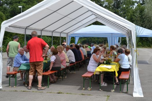 Und am Sonntag trafen sich die Mitglieder der DJK und des Reha-Sports bei ihrem Häusl auf dem Sportplatz in Rohrbach zu ihrem inzwischen auch schon traditionellen Sommerfest. Auch hier hatten die Organisatoren Glück mit dem Wetter wie die anderen Vereine auch. Der kurze, kleine Regenschauer am späten Nachmittag verdampfte sofort auf dem Asphalt. Aber zum Schutz gegen die pralle Sonne hatten sie zumindest ein Zelt aufgebaut, um so die große Hitze auf dem Skaterplatz etwas zu mildern, denn Schatten spendende Bäume fehlten hier leider. Während am Sonntag die eher älteren Mitglieder feierten, hatten die Kinder tags zuvor ihr Fest mit Übernachtung auf dem Fußballplatz.