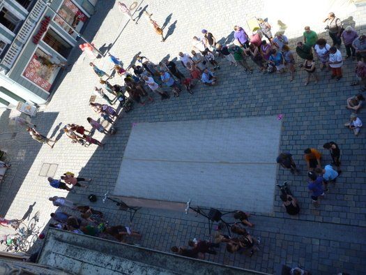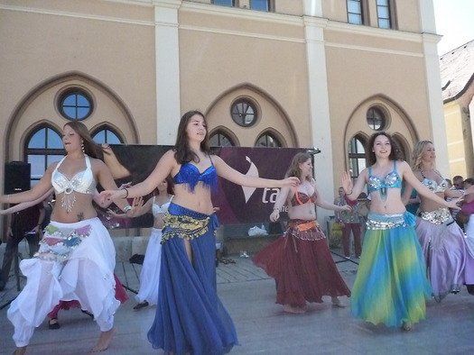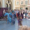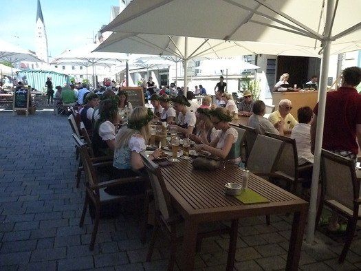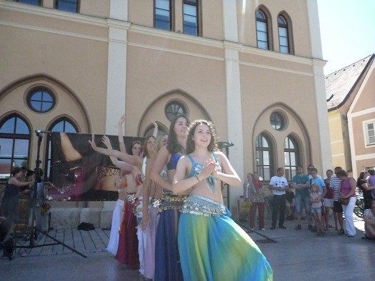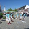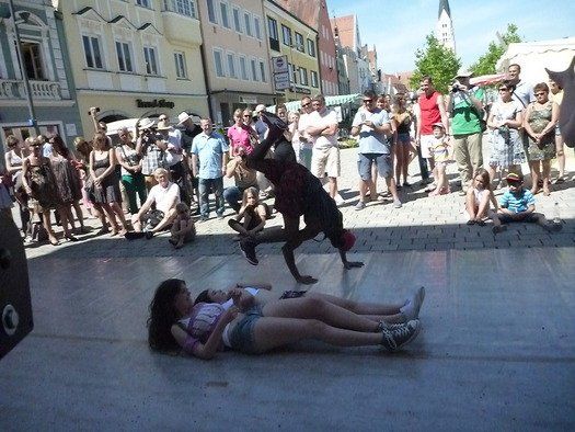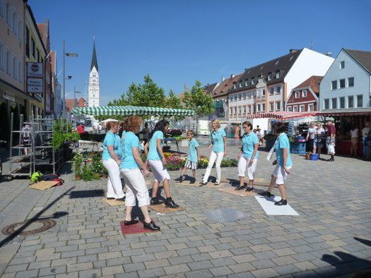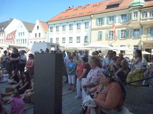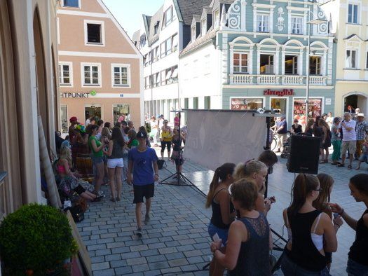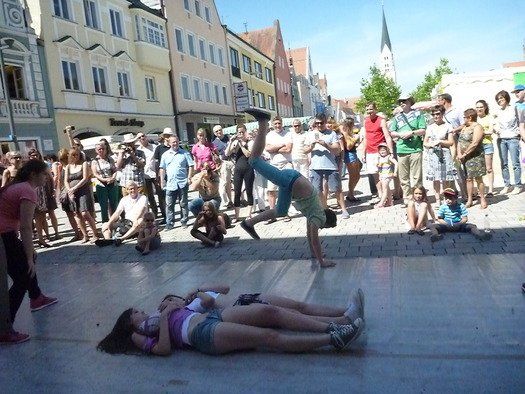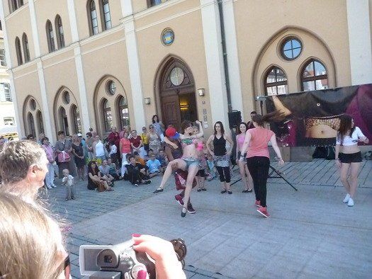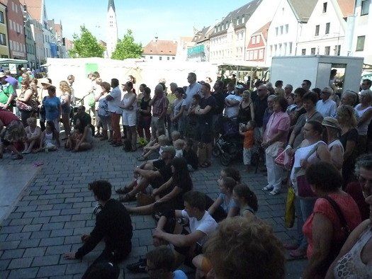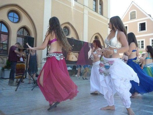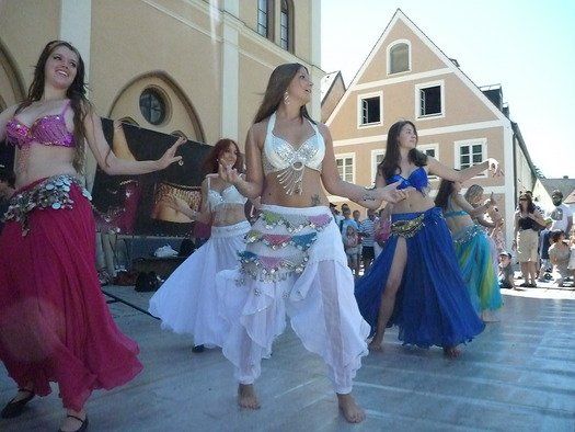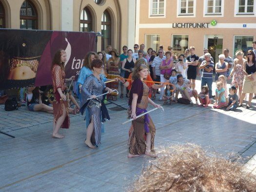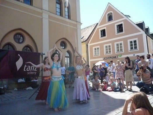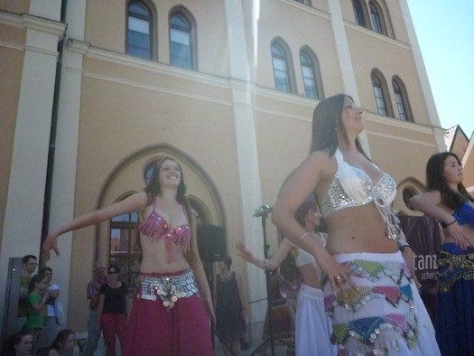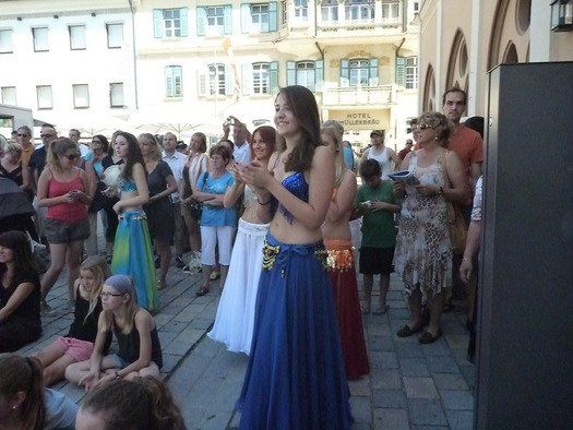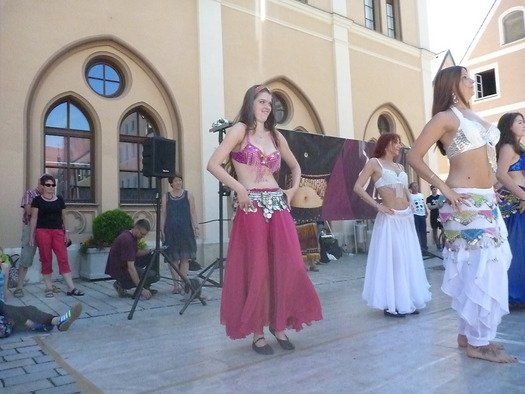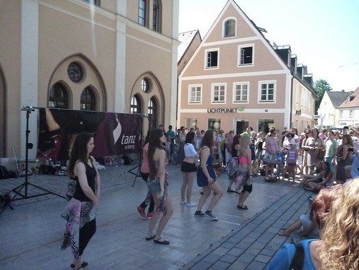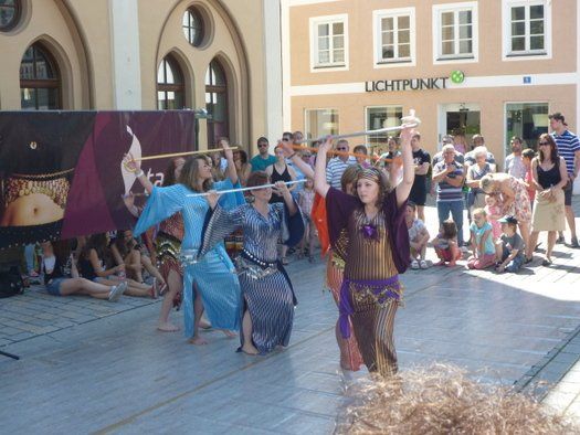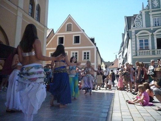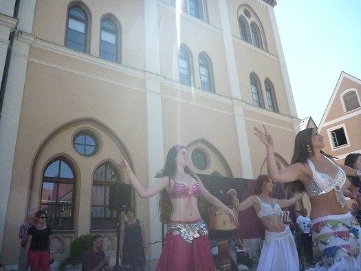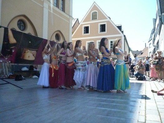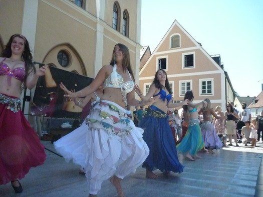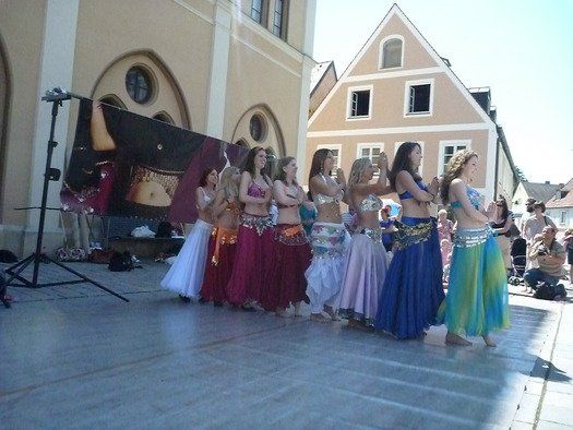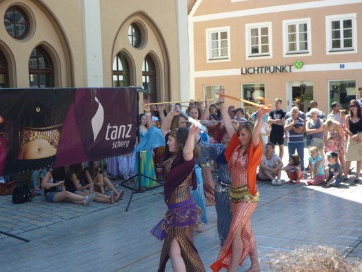 Zünftige bayerische Weisen vom Hotel Müllerbräu mischten sich da akustisch ab und zu ein, was aber der Dynamik keinen Abbruch tat. Der Wochenmarkt war trotz, oder gerade wegen der hochsommerlichen Temperaturen gut besucht, und so konnten sich die vielen Tanzgruppen über angemessenen Applaus freuen. Bauchtanz a la Shakira, oder mehr klassisch oder geruhsam, wer die Wahl hat, hat die Qual, auf jeden Fall etwas für das Auge. Da schlagen Männerherzen schneller und die Damen nicken anerkennend. Etwas Brasilianisches nach der Weltmeisterschaft war auch dabei, die Ideen für Tanz scheinen nicht auszugehen.