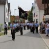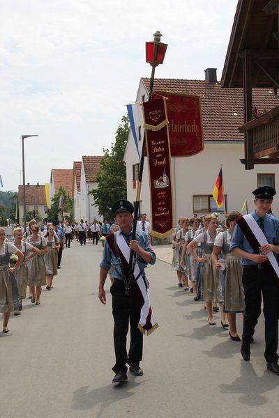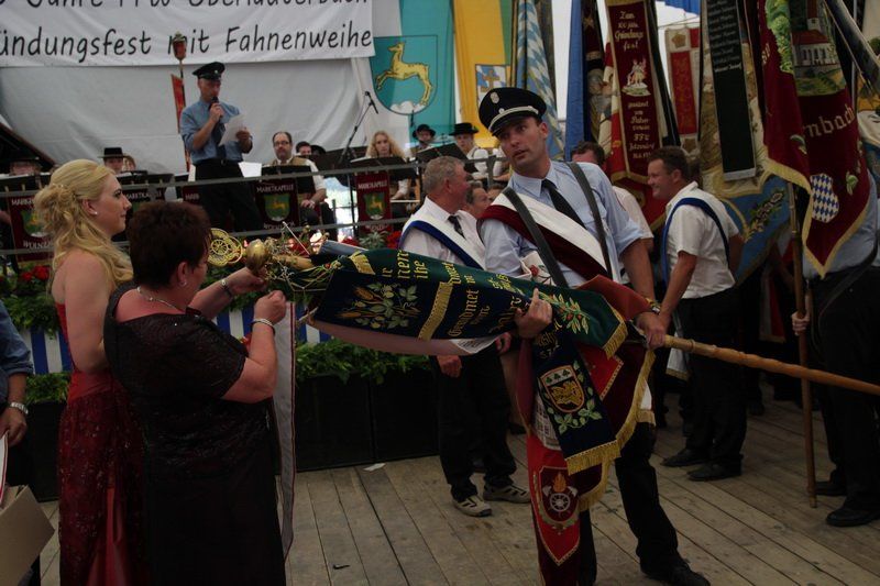 Nach diesen Worten, war es nun Zeit, die neue Fahne, die auf der einen Seite die Kirche von Oberlauterbach und auf der anderen den Schutzpatron aller Feuerwehrmänner zeigt, erstmals zu enthüllen und nach dem Segen der Öffentlichkeit zu zeigen. Diese Ehre gebührte Fahnenjunker Michael Sandbichel. In einem Festzug zogen die Vereine und Kapellen einmal quer durch Oberlauterbach. „Es war gar nicht so leicht“, erklärte Alfons Lemle, Vorstand der Feuerwehr. Rund 1400 Feierende zogen gemeinsam mit den Oberlauterbachern durch die Straßen. „Einfach gigantisch“, so das Resümee von Kommandant Christian Portner. Dem hatte auch der Vorstand nicht mehr hinzuzufügen: „Es war ein wunderschönes Fest. Aber besonders freut mich der große Zusammenhalt und die großes Hilfsbereitschaft.“ Schon bei den Vorbereitungen hatte jeder mitgeholfen, so wurden die drei Tage wirklich zu einem unvergesslichen Erlebnis. „Uns hat es sehr gefreut, dass so viele gekommen sind, um gemeinsam mit uns zu feiern“, fügte Lemle weiter an. Und damit man sich auch noch lange an diesen Tag erinnern wird, übereichte Fahnenmutter Monika Lemle gemeinsam mit Fahnenbraut Sabrina und den Festdamen Bänder für über 80 Fahnen.