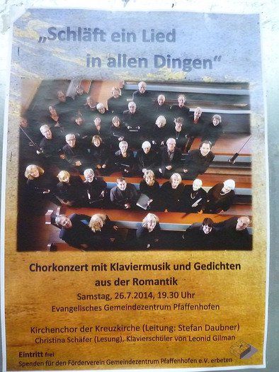 „Schläft ein Lied in allen Dingen“, ein Konzert mit Klaviermusik und Texten aus der Romantik hat im evangelischen Gemeindezentrum stattgefunden. Der Kirchenchor der Kreuzkirche hat unter der Leitung von Stefan Daubner Lieder aus der Romantik von Schubert bis Schuhmann intoniert.