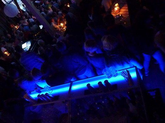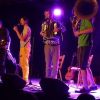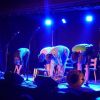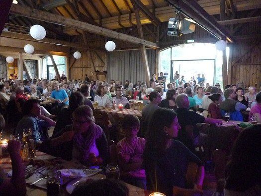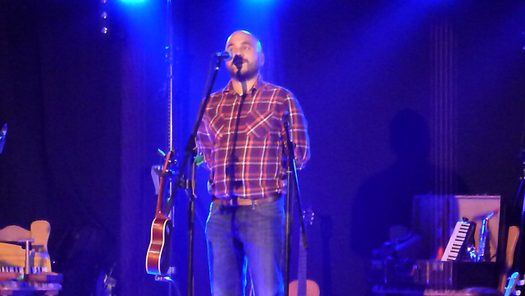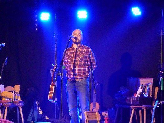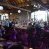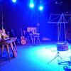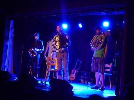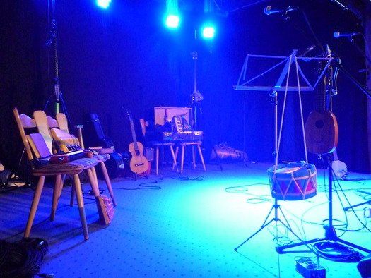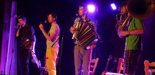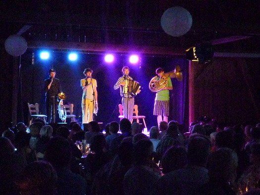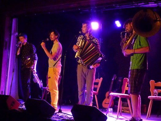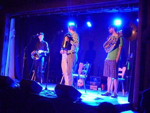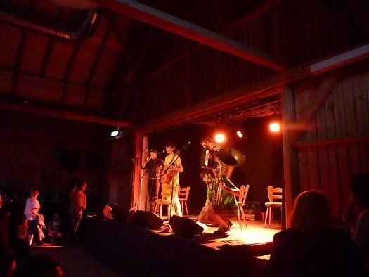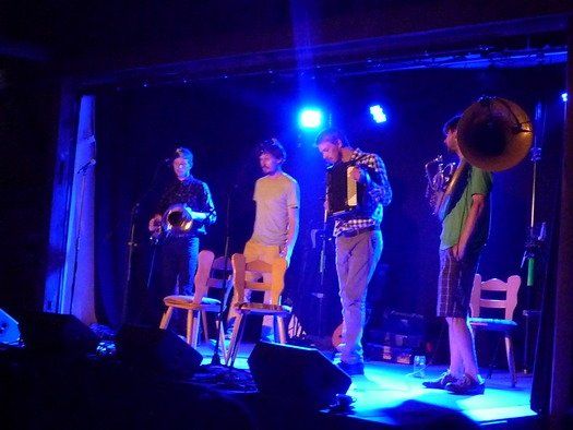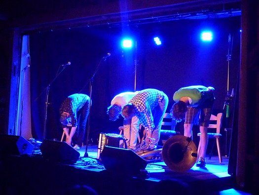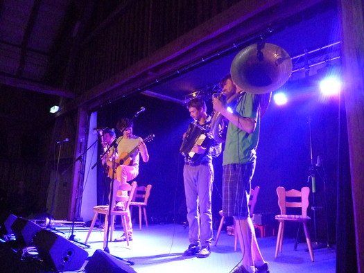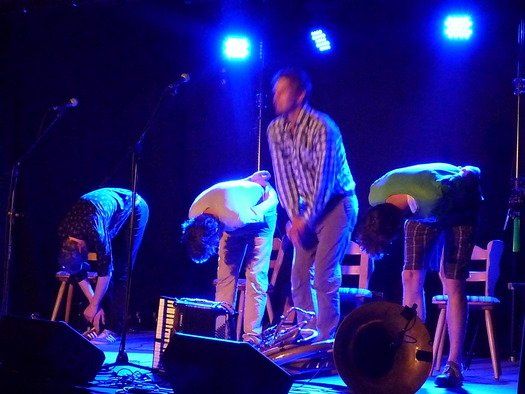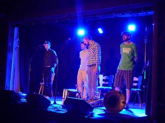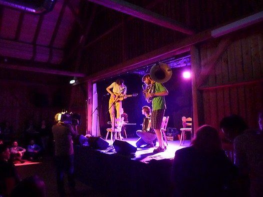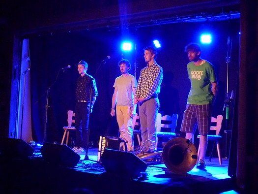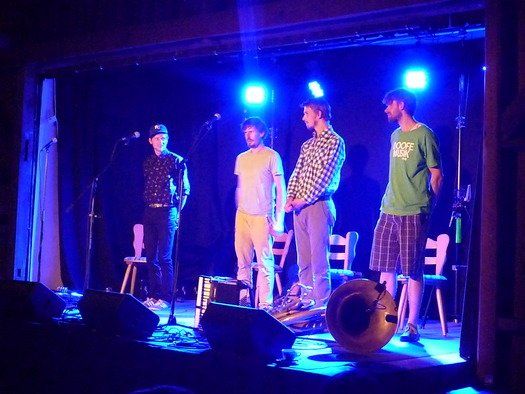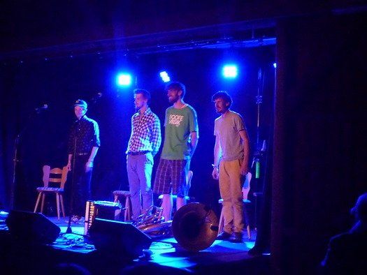 Eine andere Klangwelt hatte Kofelgschroa im Tornister, der symbolische Wurf einer Küchenuhr ins Publikum machte die Zeit greifbar und haltlos. Als wollten sich die vier jungen Männer auf der Bühne erst einmal einspielen, zogen sie langsam und stetig die Lautstärke im Saal nach unten, sowie die Wachsamkeit nach oben auf die Bühne. Wer nicht Kenner der Oberammergauer Musikanten war, nahm zwangsläufig eine gespannte Aufmerksamkeitshaltung an. Die ersten Texte kamen unerwartet aus der Klangwolke und verdichteten sich zu einem mehrstimmigen Mantra. Im Laufe des Konzertes, oder war es mehr eine Wolkenmesse, hob der ganze Stockerstadel wie ein bayerischer Aschram ab.