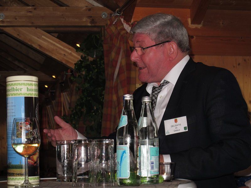 Zum Austausch der Geschenke, hier Hommelbier, dort Hopfentasse mit Hopfentee und Hopfenschnaps, widmete Guy Osteux, der Vorsitzende des Partnerschaftsausschusses, einige Worte der historischen Bedeutung der Verbrüderung Poperinges mit Wolnzach. Knapp 50 Jahre besteht sie schon. Osteux: „Wir sind stolz auf unsere Partner!“