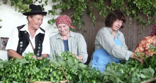 Auf ihren „Schamerln“ sitzend zupften die fleißigen Pflückerinnen unter den neugierigen Blicken der Zuschauer das grüne Gold von den Reben. Wer noch nie echten Hopfen gesehen hatte, durfte natürlich selber Hand anlegen und somit die Faszination „Hopfen“ hautnah erleben.