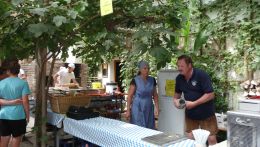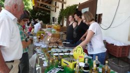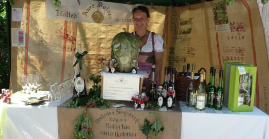 Gegen 10 Uhr etwas öffnete dann auch der Bauernmarkt, der wie jedes Jahr neben zahlreichen Hopfenprodukten auch einen Probeausschank von Bieren mit neuen Hopfensorten, Hopfenlimonade, Hopfensecco, oder dem Holledauer Hopfagschbusi von Hildegard Heindl aus Au i. d. Hallertau umfasste.