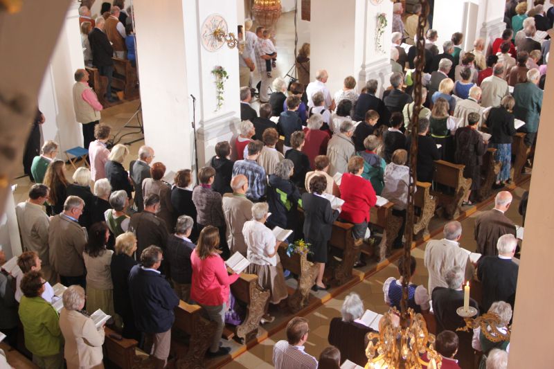 Das musikalische Programm war demnach auch darauf ausgerichtet, die Vielfalt des Chors unter der Leitung von Markus Rupprecht dem breiten Publikum zu vermitteln. Beginnend mit Auszügen aus "Missa come fuggir" von Hans-Leo Hassler (16. Jahrhundert) ging die musikalische Zeitreise anschließend ins 19. Jahrhundert mit Teilen der "Missa St. Crucis" von Joseph Gabriel Rheinberger. "I will praise thee, o Lord" von Knut Nystedt führte die Gottesdienstteilnehmer in die zeitgenössischen Kompositionen, bevor als Höhepunkt mit "Gaudium Domini" eine spezielle Auftragskomposition von Christian Heiß zum 100jährigen Bestehen des Basilikachors zum ersten Mal vor Publikum vorgestellt wurde.
