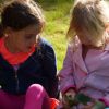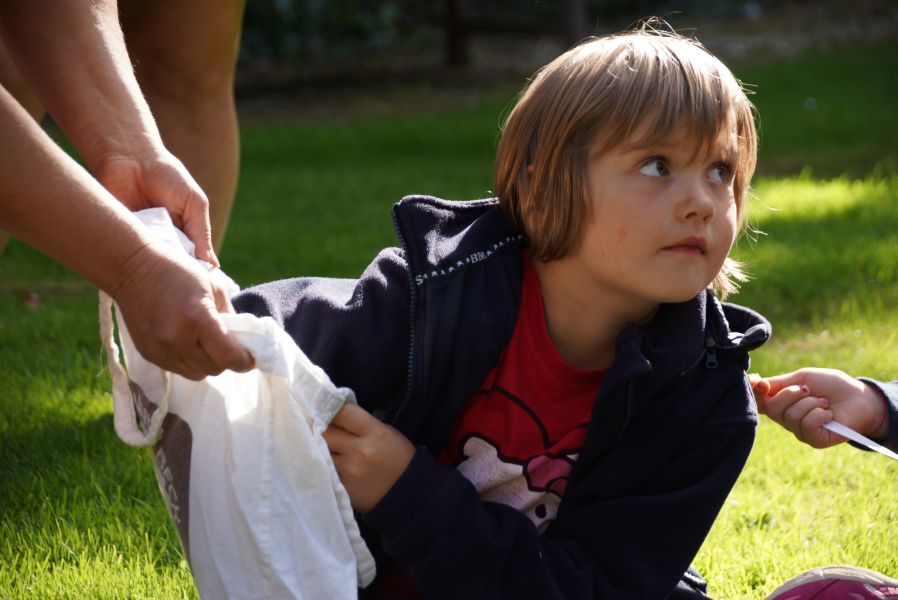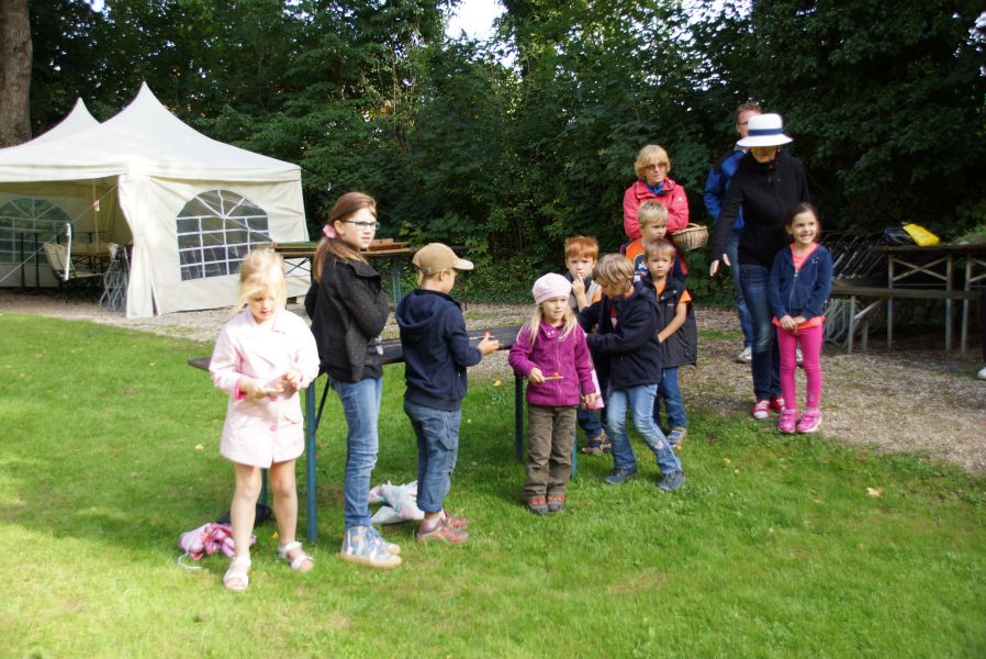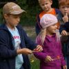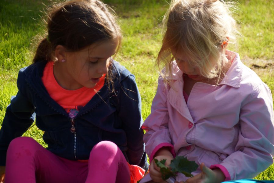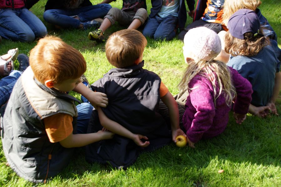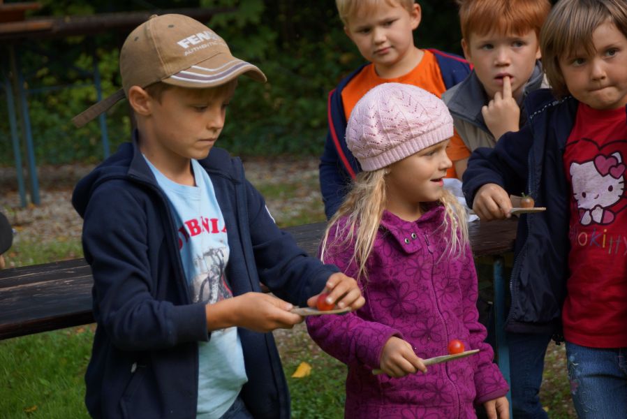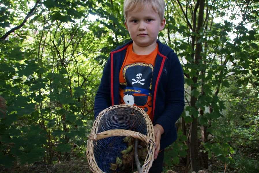 Mit Säckchen oder Korb bewaffnet zog der Trupp los und sammelte alles ein, was es so an Schätzen der Natur zu finden gab. Da kam einiges zusammen. Von besonderen Steinen, Tannenzapfen, Eicheln, Haselnüssen, Hagebutten, bis hin zu Blättern aller Art, Holzstücke, und sogar Tomaten und Äpfel fanden die kleinen Entdecker.