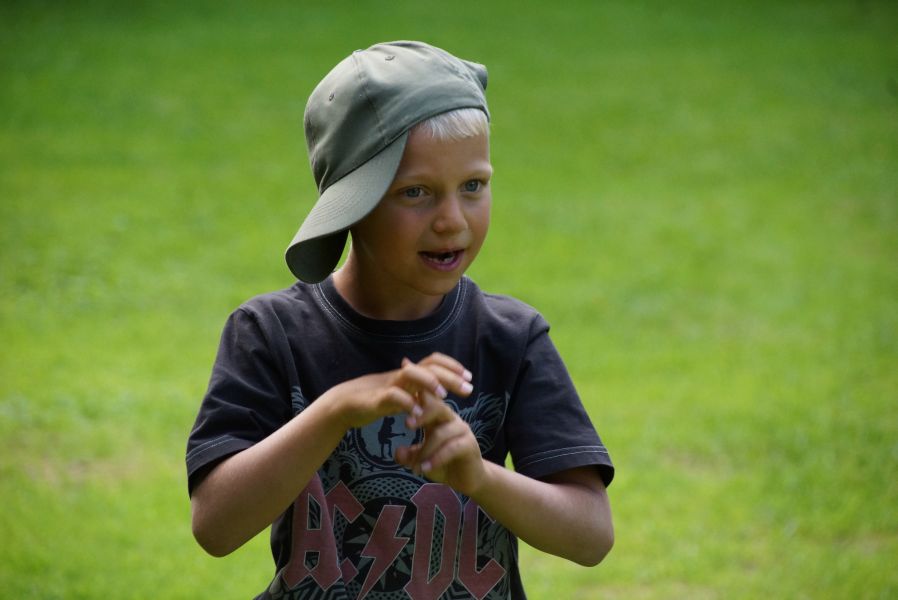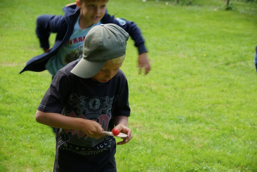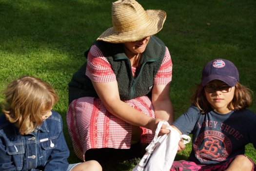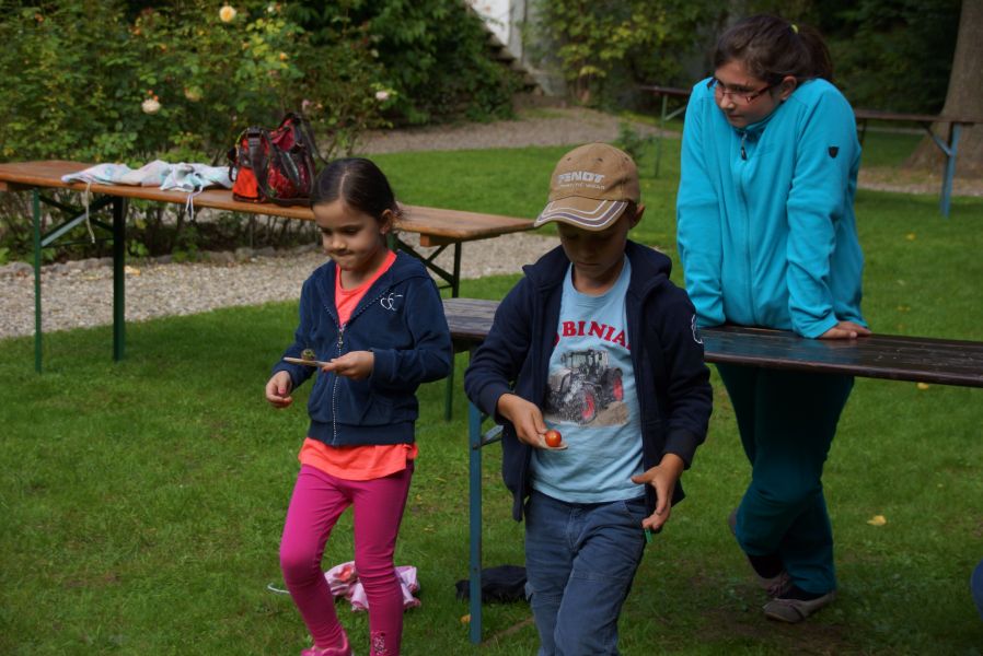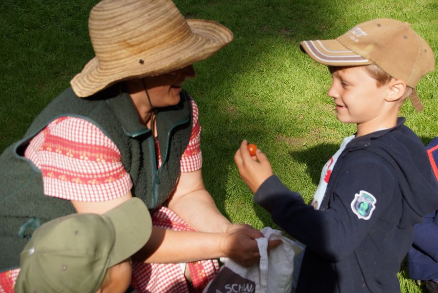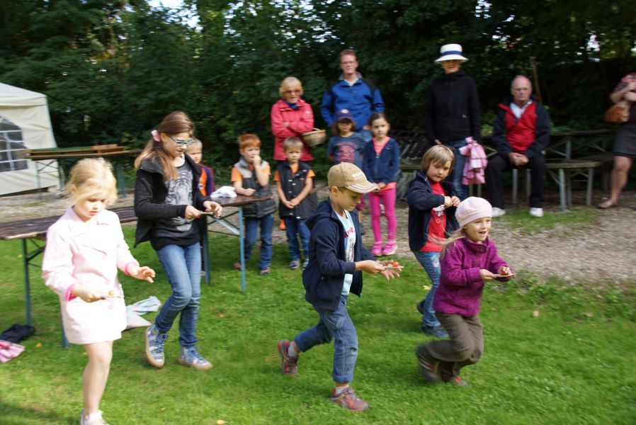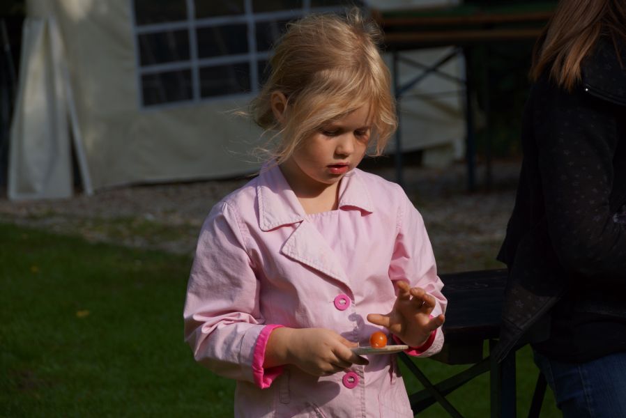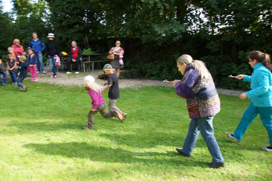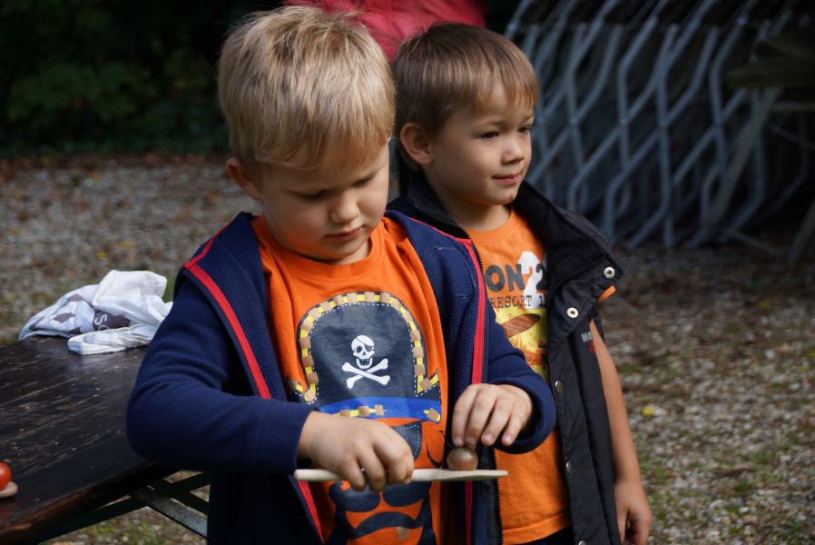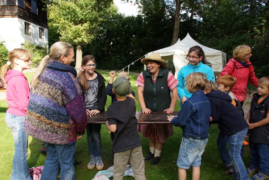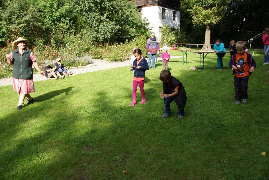 Voller Begeisterung ließen sich die 4 – 9jährigen die verschiedenen Tast- und Geschicklichkeitsspiele, wie den „Tomatenlauf“ und das altbayerische Wurfspiel „Brackeln“ zeigen.