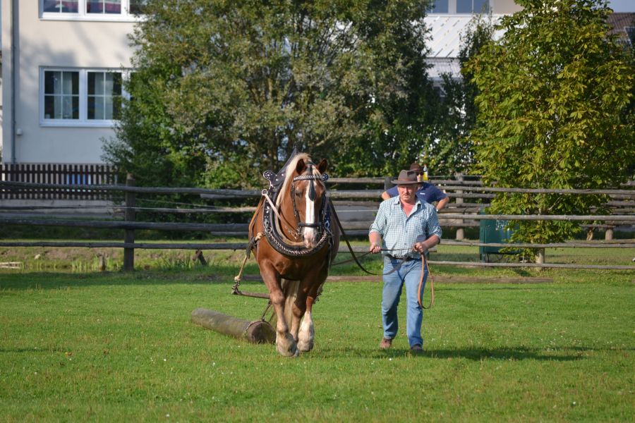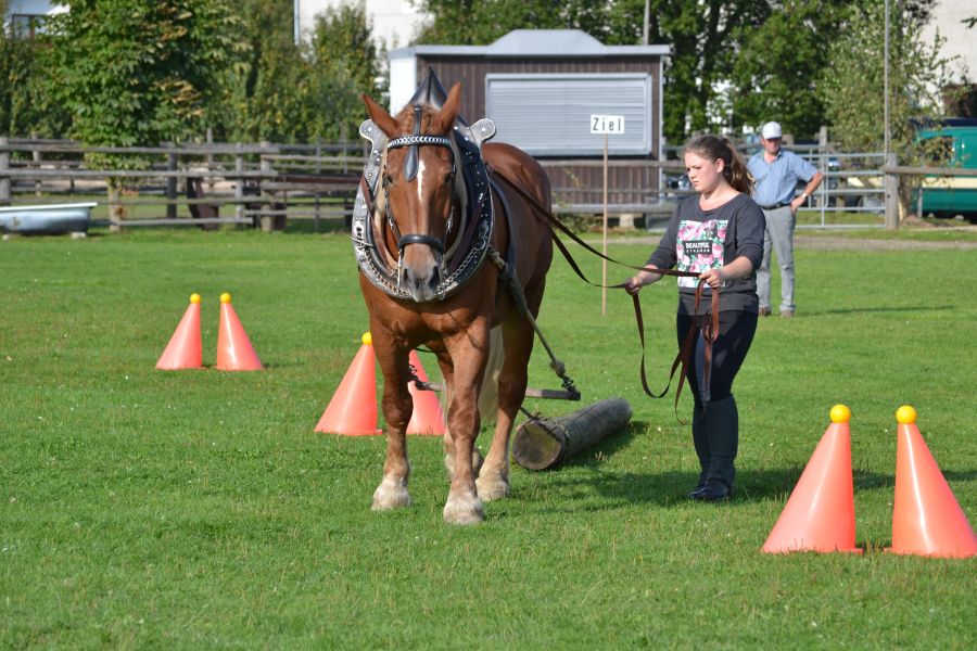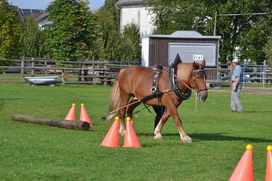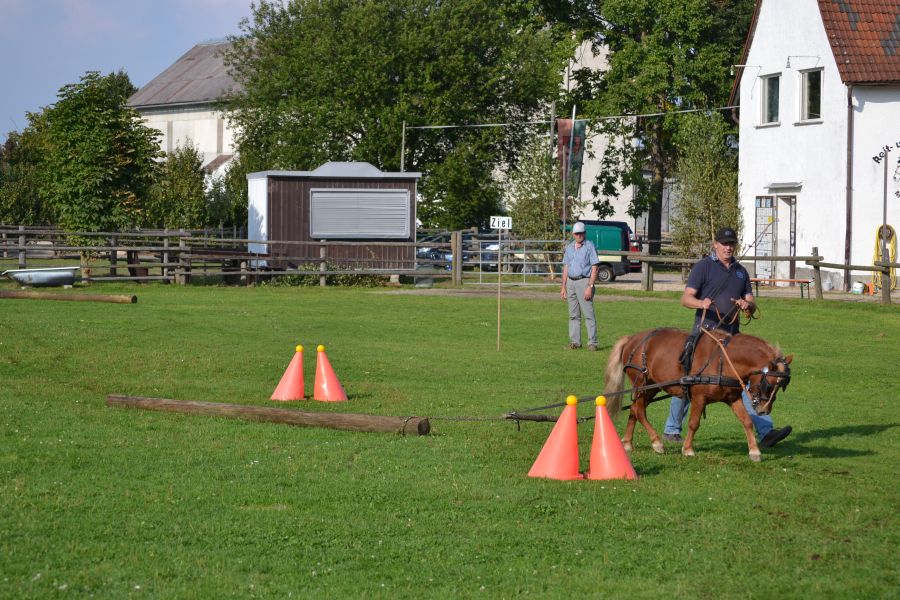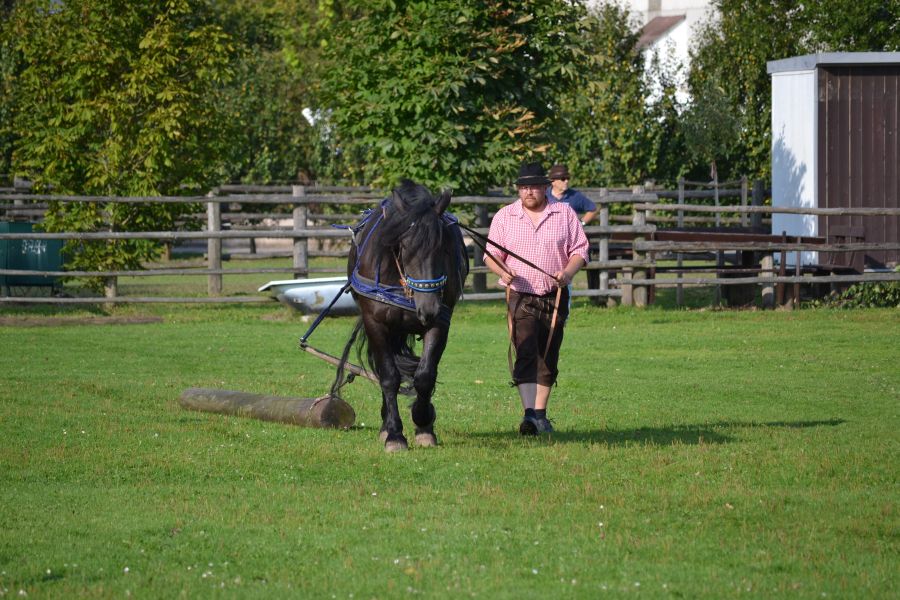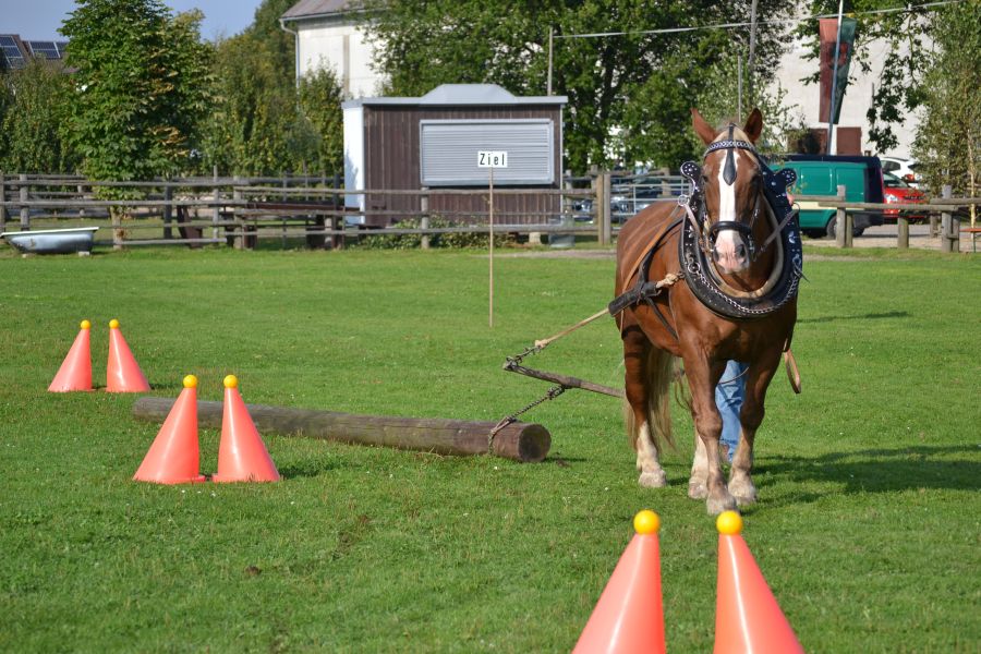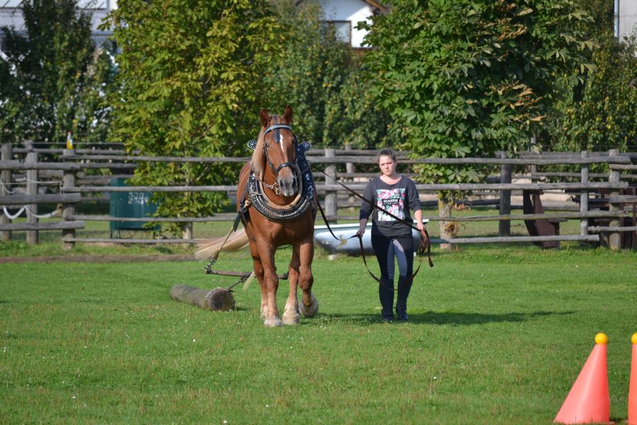 Die Zeit, dass Pferde als Arbeitstiere herhalten müssen, ist zwar schon lange vorbei, trotz allem ist das Schwachholzziehen immer noch Prüfungsbestandteil. Für die großen Tiere war das Ziehen des Stammes weniger ein Problem, als Fehlerlos durch die den Parcours zu kommen. Dagegen war es für die Kleinen schon eine Herausforderung die schwere Last zu ziehen, was die Pferde aber allesamt mit Erfolg meisterten.