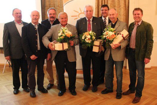 von links: Max Hechinger (Kreisrat), Benno Zierer (MdL), Josef Finkenzeller (2. stv. Landrat), Josef Alter, Albert Huch, Herbert Nerb (Bürgermeister Manching), Josef Stangl, Christian Dierl (Kreisvorsitzender der FW); auf dem Foto fehlt unter den Geehrten: Alois Eisenmann