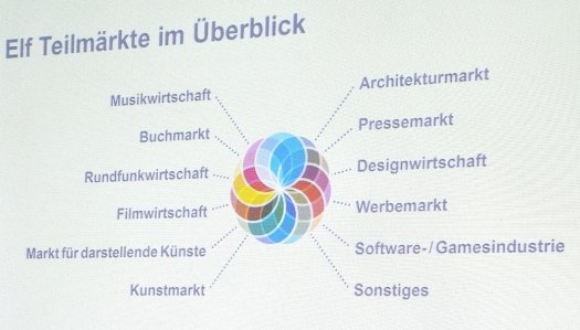 Jürgen Enninger, Leiter des Kompetenzteams Kultur- und Kreativwirtschaft der Landeshauptstadt München gab den Zuhörern einen Überblick, aus welchen elf Teilmärkten die Branche überhaupt besteht (siehe nachstehendes Foto).