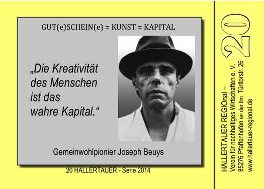Regionalgeld: “ist eine lokale Komplementärwährung, die innerhalb des regionalen Währungsgebiets als Zahlungs-, Investitions- und Schenkungsmittel zwischen Verbrauchern, Anbietern und Vereinen verwendet wird“, so WIKI. In Pfaffenhofen ist es der Hallertauer, der seit mittlerweile 10 Jahren in unterschiedlichen Erscheinungsformen als Zahlungsmittel bei den entsprechenden Akzeptanzstellen eingesetzt werden kann. Das Besondere an unserer heimischen Währung sind die 3 % des generierten Wertes, die in ein Kunstprojekt fließen, das der „Erschaffer“ selbst bestimmen kann.