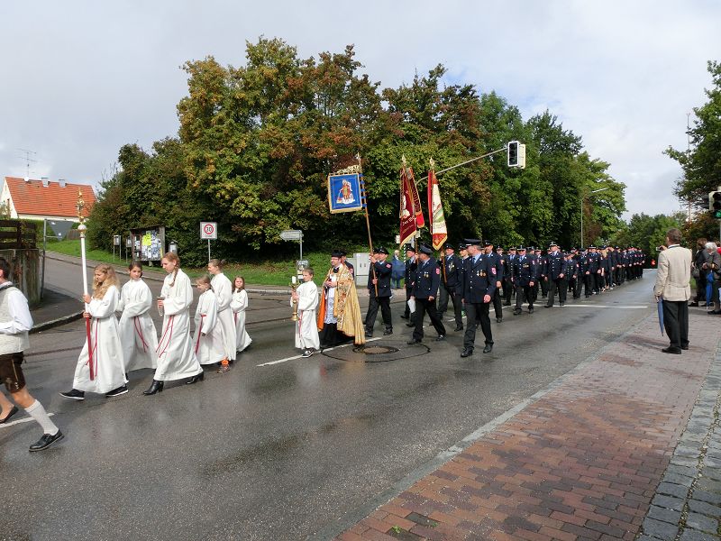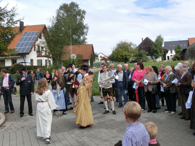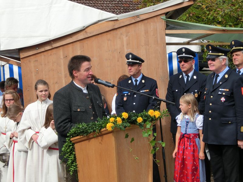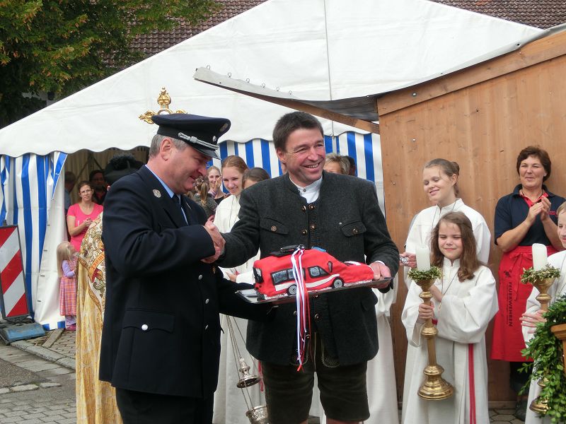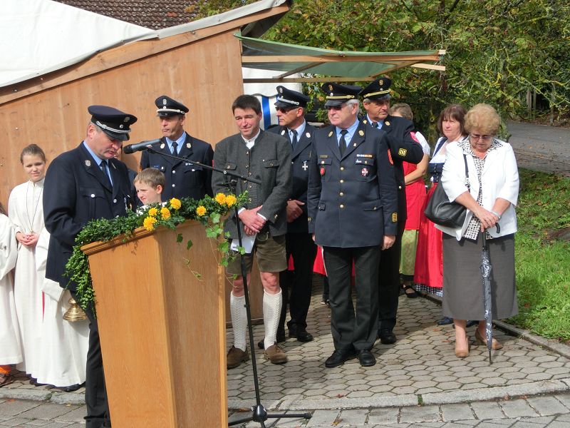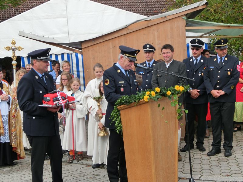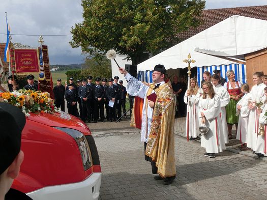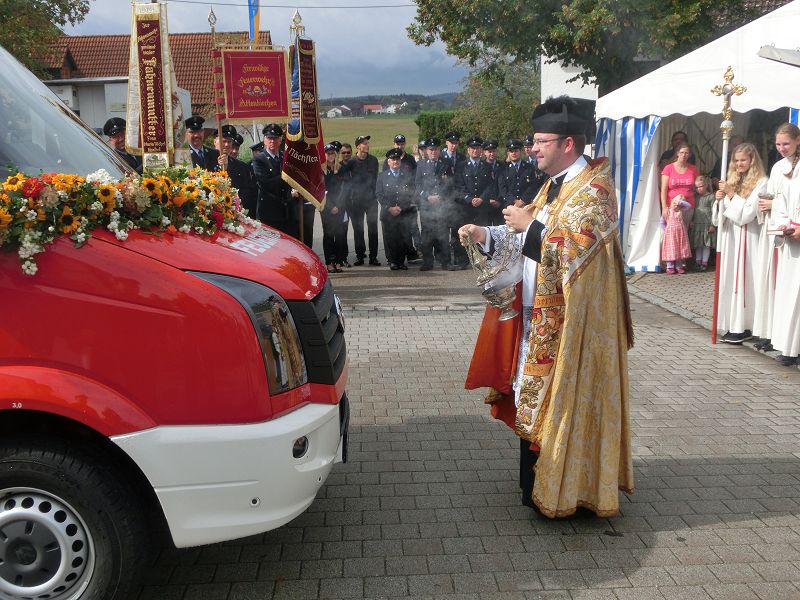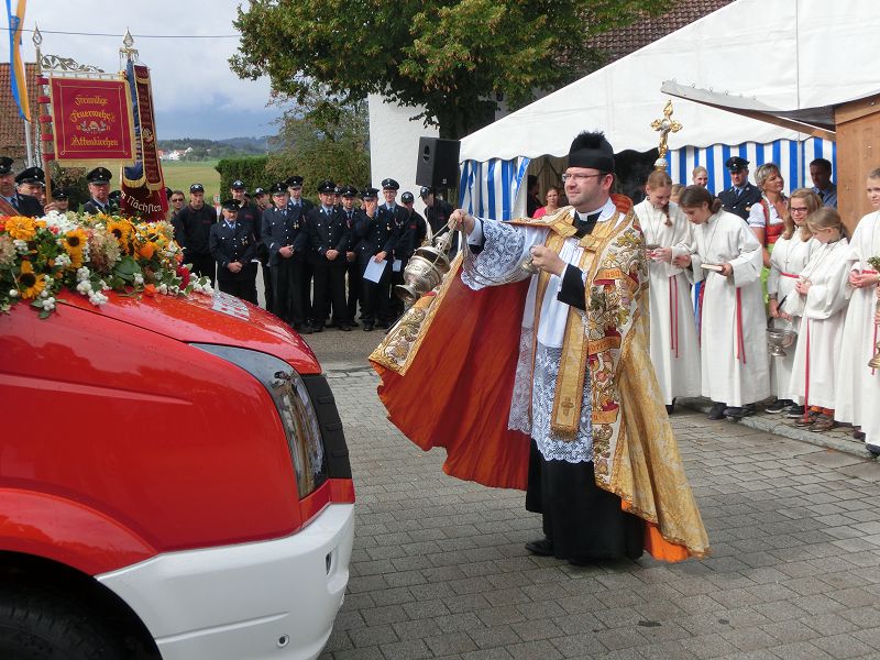 Nach einem feierlichen Festgottesdienst zog, angeführt von einer Abordnung des Musikvereins Zolling, Pfarrer Stefan Rauscher mit Ministranten, dahinter viele Feuerwehrler und Gemeindemitglieder, in Richtung Feuerwehrhaus. Dort stand schon das festlich geschmückte Fahrzeug bereit. Nach einigen Regengüssen vorher schien dazu sogar die Sonne und hielt aus bis zum Schluss der Zeremonie. Der 1. Kommandant, Norbert Wurzer, begrüßte das gesamte Kreisbrandkommando, Bürgermeister Bormann und Vorgängerin Niedermeier sowie zahlreiche Gemeinderäte. Die Finanzierung des Wagens sei getragen durch die Gemeinde Attenkirchen, einem Zuschuss des Freistaates Bayern sowie durch die Feuerwehr Attenkirchen selbst. Durch immer mehr Einsätze aufgrund des erhöhten Verkehrsaufkommens sei man gezwungen gewesen, ein neues Fahrzeug anzuschaffen. Auch für die Jugendausbildung sei dies vonnöten. Dann übergab er an Pfarrer Rauscher, der das Fahrzeug sowie die Anwesenden mit Weihwasser segnete. Anschließend übernahmen noch Bürgermeister Bormann sowie Kreisbrandrat Fischer das Mikrofon und wünschten allen Beteiligten viel Glück bei ihren Einsätzen mit dem neuen Feuerwehrfahrzeug.