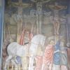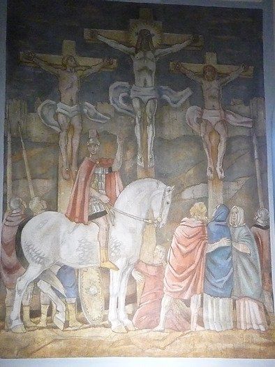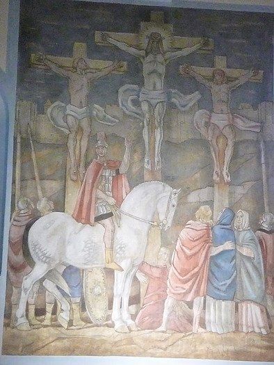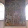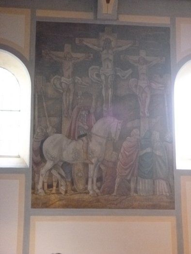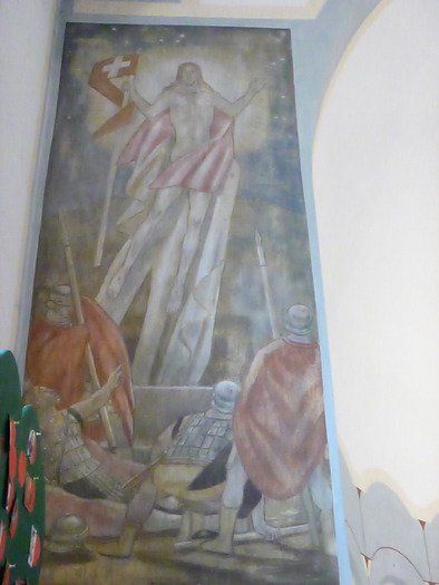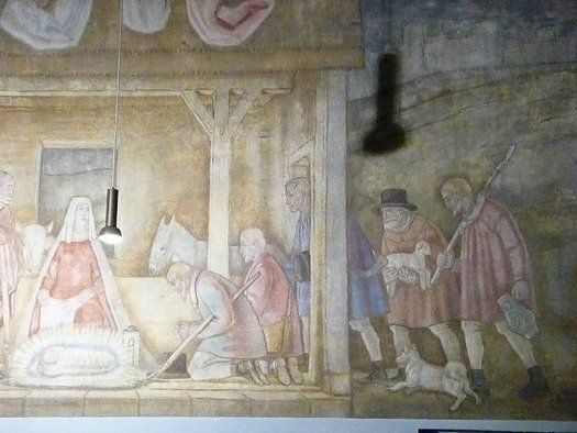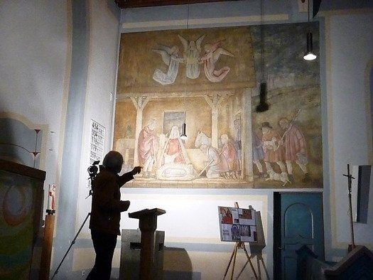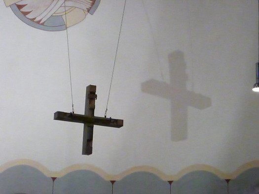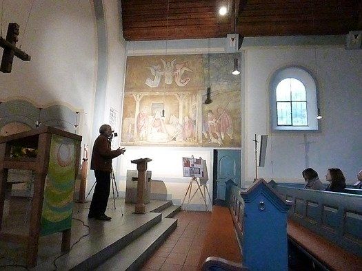 Die drei großen Bilder, die für eine protestantische Kirche sehr ungewöhnlich sind, warteten mit weiteren Geheimnissen der Bildsprache auf. Ein Fenster hinter der Gottesmutter in der Krippenszene deutet zum Beispiel auf deren Verbundenheit zum Himmel hin. Der Erlöser nach der Auferstehung, mit einem gleichschenkligen Kreuz, das an ein Pluszeichen erinnert, symbolisiert das Positive der Glaubensgrundlage.