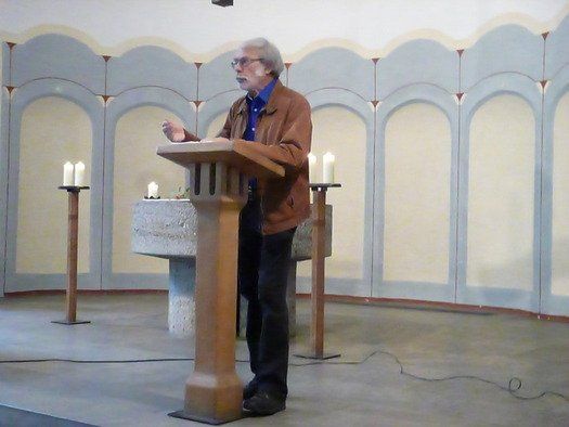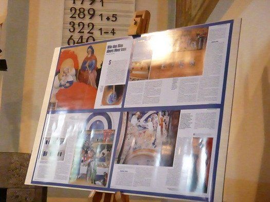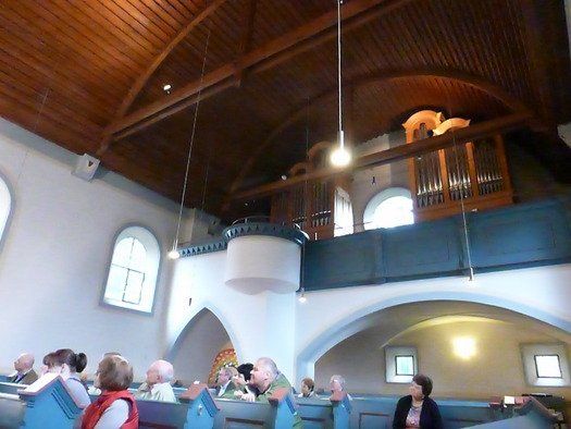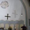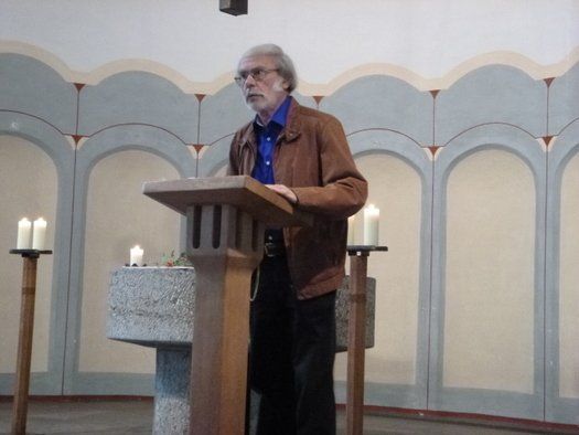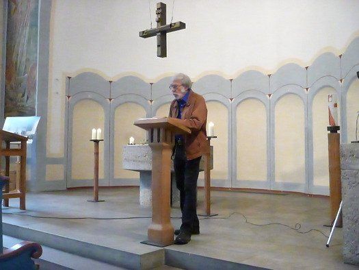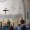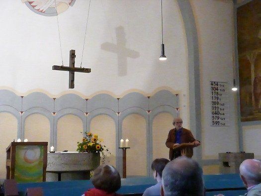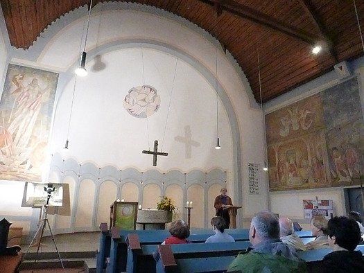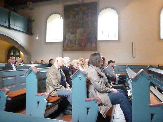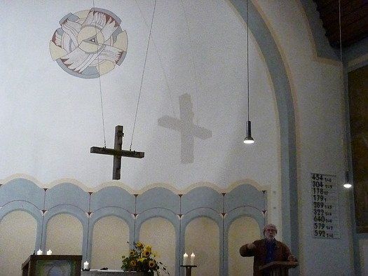 Viele Veränderungen des Altarraumes, auch der neuen Kirchenphilosophie geschuldet, haben in den 70er Jahren unter anderem die Kanzel überflüssig gemacht und den Pfarrer Richtung Gemeinde predigen lassen. Der Altar wurde zum Mittelpunkt der Kirchenfront, umwölbt von Nischen in roter Umrandung. Roland Gronau erklärte den neugierigen Besuchern nicht das Sichtbare, die Bedeutung der Symbolik der Farben und Formen im Innenraum waren wesentlich aufschlussreicher.