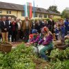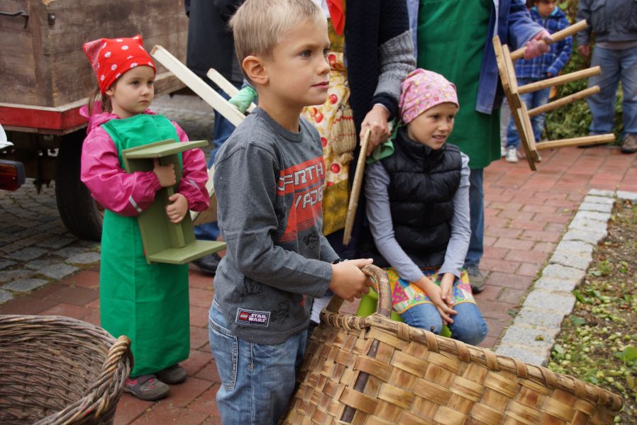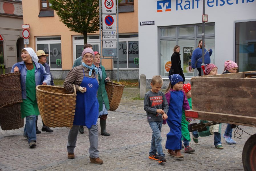 Eine Handvoll fleißige Zupferinnen und einige kleine Helferinnen und Helfer machten sich am Samstagvormittag an die Arbeit. Mit „Pauken und Trompeten“ und mit Geleit der Mainburger Stadtoberhäupter, den Delegationen der drei Partnerstädte Moriya/Japan, Liancourt/Frankreich und Festos-Zaros/Kreta und der Bierkönigin Anna Baum zogen sie, dafür „bewaffnet“ mit Hocker und Kirm, Richtung Griesplatz.