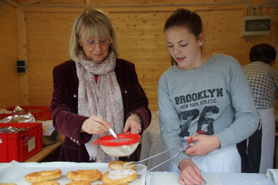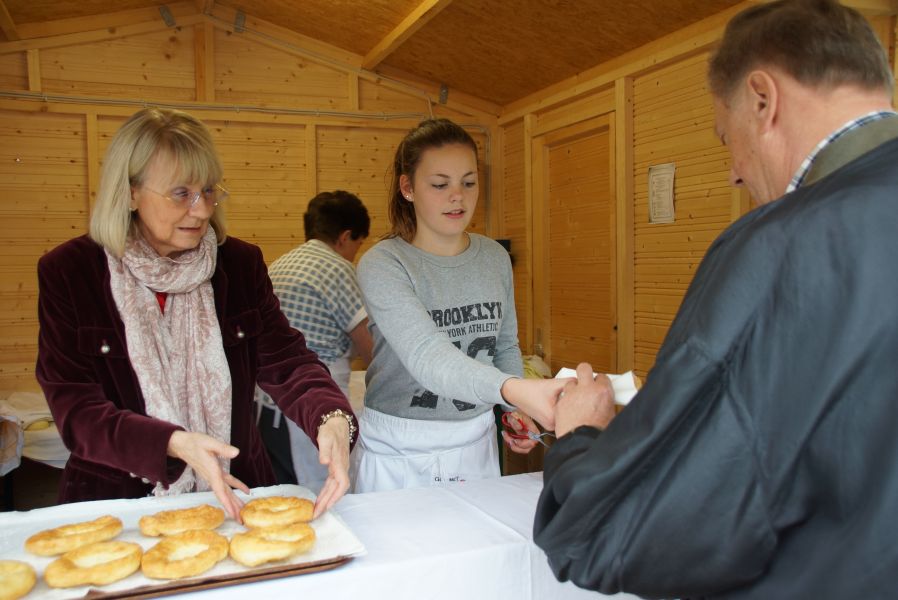 Zum Zwölf Uhr Läuten stand das traditionelle „Hopfazupfamahl“ auf dem Speisezettel, das sich die ausharrenden Besucher, Vereine und natürlich allen voran die Zupferinnen mehr als verdient hatten. Für den kleinen Hunger zwischendurch backte die Großgundertshauser Bäuerin Anna Meier leckere „Auszogne“, die, heiß und bestreut mit Puderzucker, eine wahre Gaumenfreude waren.
