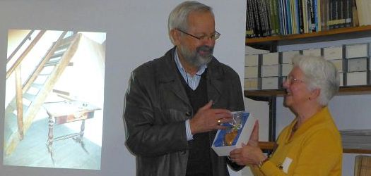 Heribert Reiter erhält als Dank für seine Museumstätigkeit ein Präsent von der Vorsitzenden des Heimat- und Kulturkreises, Ursula Beyer