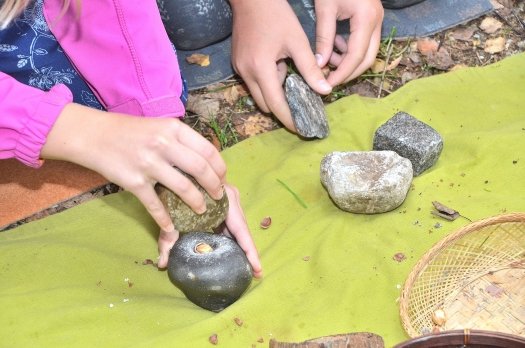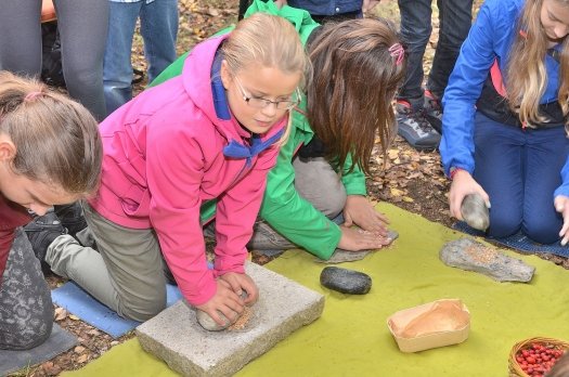 Die Natur- und Kräuterpädagogin Kainz zeigt Schülergruppen der 6. Klassen aus Wolnzach die ersten Schritte, wie sie an die Zubereitung einer steinzeitlichen Mahlzeit aus gesammelten Getreide, Beeren und Nüssen herangehen können. Der Gebrauch von Steinmessern ist dabei ebenso auszuprobieren wie das Zerreiben des Getreides, das zu damaliger Zeit Emmer und Einkorn waren.