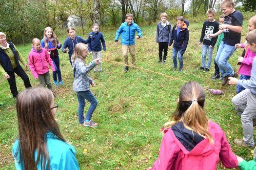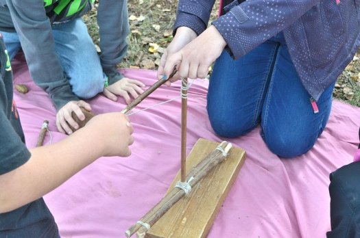 Gemeinsam wird von den Schülern sodann die mühsam zubereitete vegetarische Kost verzehrt. Wie es mit unterschiedlichen Methoden gelingt, ein Feuer zu entfachen, das demonstriert Thaller, die bereits lange Jahre in der Umweltpädagogik tätig ist, mit alten aber auch neueren Methoden. Dann darf auch von jedem Schüler selbst Hand angelegt werden. Es gilt dabei, den richtigen Dreh herauszufinden. Und zwar mit dem Feuerbohrer. Wer das nicht schafft, kann sich an die Feuersteine wagen. Zuvor muss jedoch noch gejagt werden und bei einem unterhaltsamen Spiel lernen die Kinder frühe Herangehensweisen kennen, erfolgreich Wild zu erlegen. Zum Einsatz kommt dabei eine effektive Wurfwaffe namens Bola, die noch heute beispielsweise in Südamerika verwendet wird.