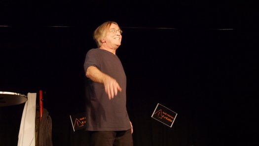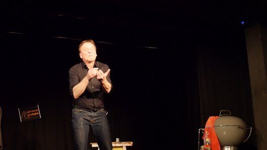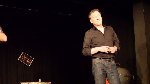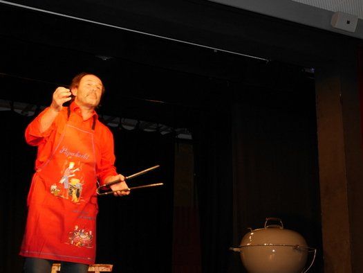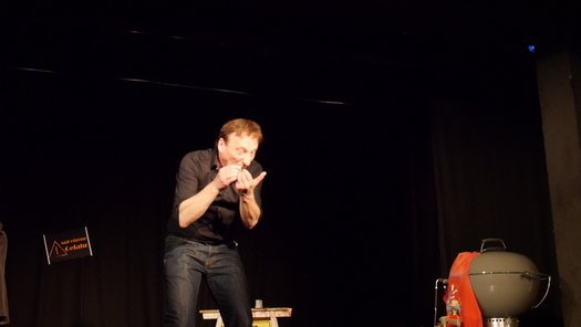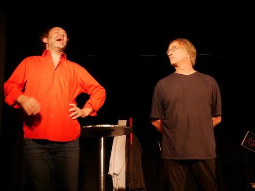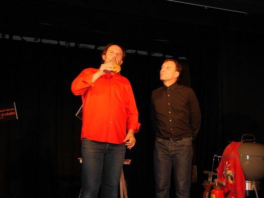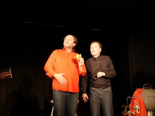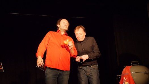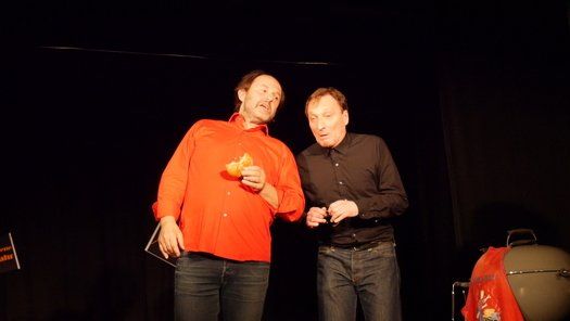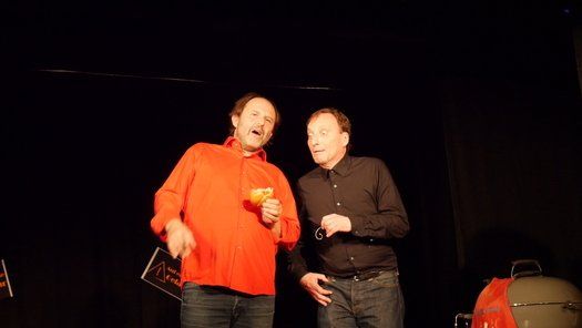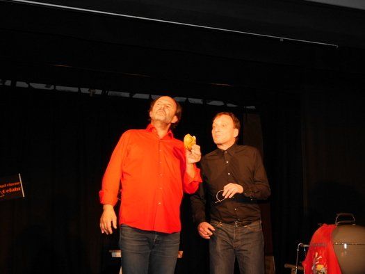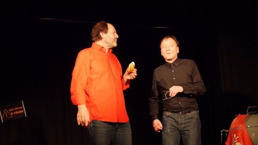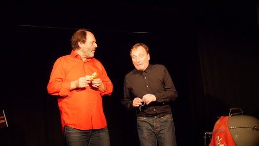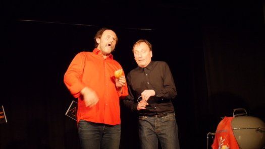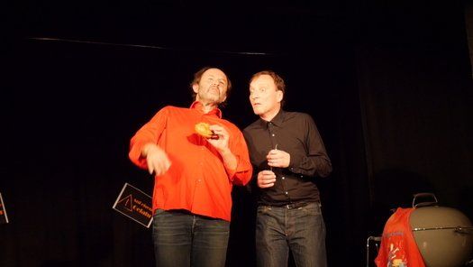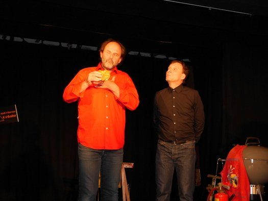 Der Programmtitel „Auf eigene Gefahr“, bezieht sich demnach auch mehr auf den „Zuazogna“ im Publikum, oder wie Fred Fesl sagt, dem „Semigeist“. Eine Bildung braucht es schon, will Frau/Mann, den teils aberwitzigen Sprach Stafetten folgen, der rein oberflächliche Zeitgenosse ist klar im Nachteil. Obwohl, die Veganernummer nach der Pause, mit Claus Drexler als Rollbratensemmelgenießer und Michael Eberle am Bratensemmelschnürl, versteht sogar das Dr. Kind aus der Burzlbaam Kita.