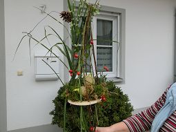 Diejenigen, die sich aber auf dem Hof des Fachwartes in Pfettrach einfanden, waren mit Begeisterung bei der Sache. Mit langen dünnen Zweigen oder starken Gräsern wurde das Außengerüst gebaut, verziert mit Hagebutten, Zieräpfeln, Tannenzapfen, Moos und Efeu. Das war jedem selbst überlassen, welche Materialien er bevorzugte. In der Mitte, auf einer Art Plattform, wurden dann Meisenknödel plaziert, die die Vögel durch das Gebinde hindurch erreichen können. Das Ganze ist aber nicht nur für die Tiere praktisch, sondern durchaus auch eine Dekoration vor dem Haus oder im Garten.