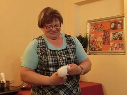 Diesmal war das Thema "Schönheitspflege für den Winter", insbesonders durch Massagen mit selbstgemachten Kräuterstempeln. Nach einigen allgemeinen Tips, wie z.B. Tautreten nach Pfarrer Kneipp, Waschungen mit Apfelessig zur Regeneration der Haut oder trockenens Ganzkörperbürsten kam sie zum eigentliche Thema: den Kräuterstempeln.