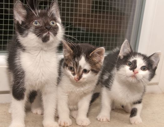 Bei diesen drei Kätzchen handelt es sich um eine Hälfte des 6er-Wurfes, den die Mutterkatze Fiona vor etwa zehn Wochen zur Welt gebracht hat. Zum kompletten Sechserpack gehört ein schwarzweißes Katerchen, von den fünf Mädchen sind zwei ebenfalls schwarzweiß, zwei komplett schwarz und eines dunkelgetigert mit Weiß.